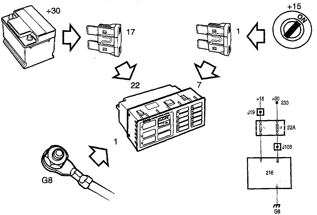 +30 gives power voltage and is fed via fuse 17 in fuse holder 22A to pin 22 on the ACC control module