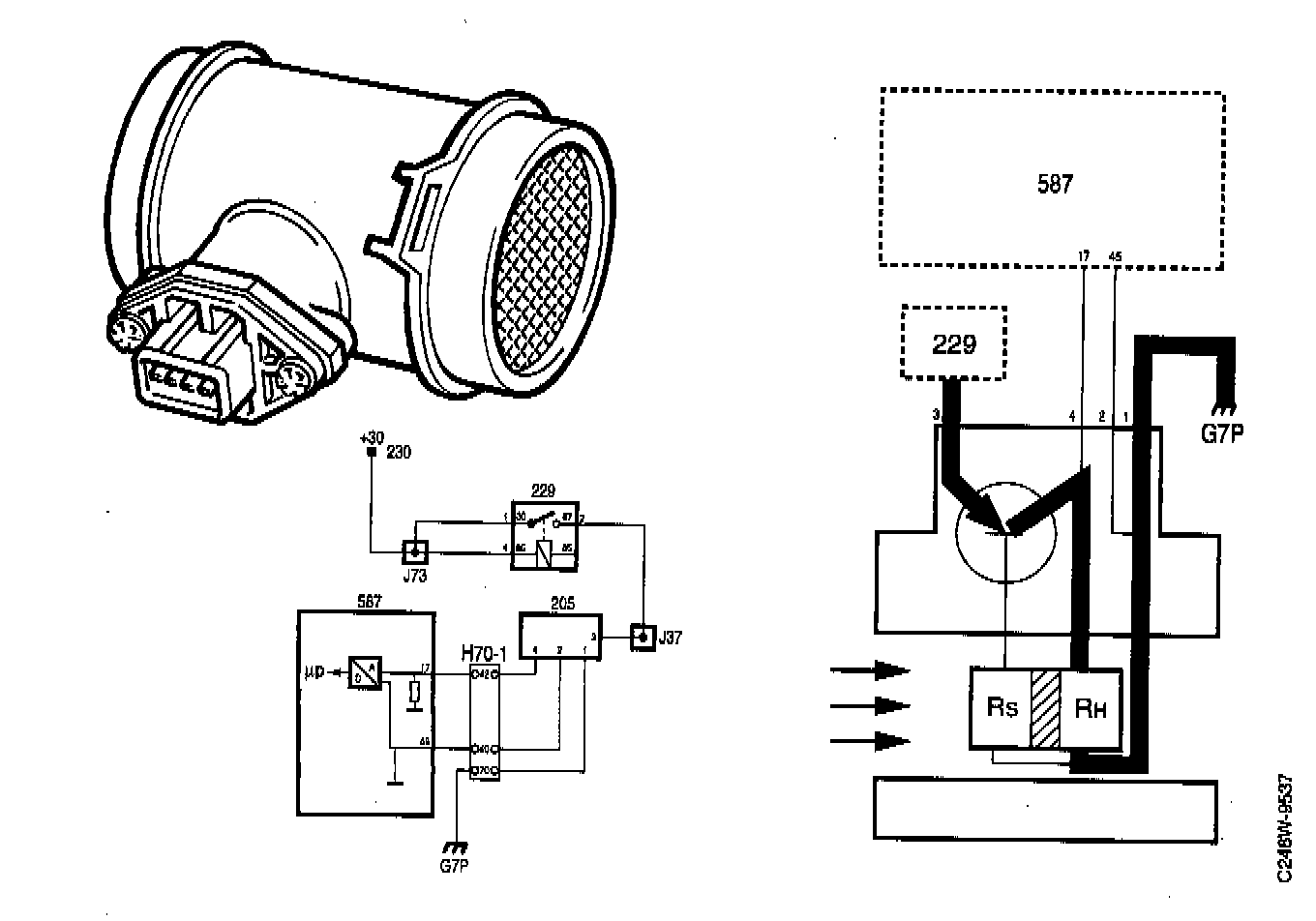 The mass air flow sensor contains a ceramic plate which is positioned in the air flow and heated electrically to 180°C (356°F). When the air flow increases, the heating element requires a higher voltage to maintain the temperature at 180°C (356°F).