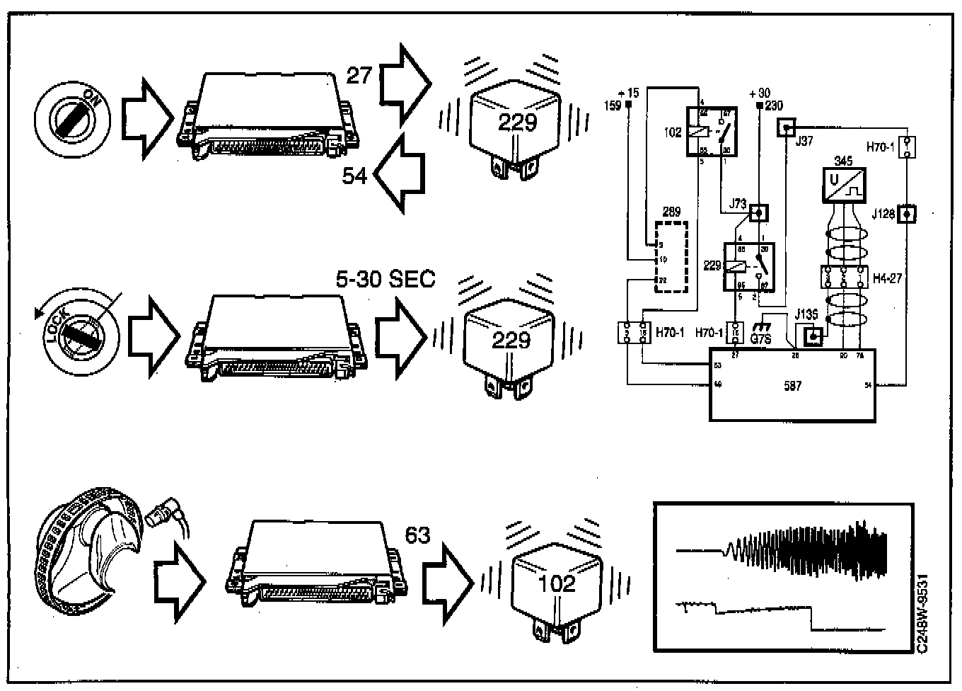 When the ignition switch is turned to the ON position, current is applied to pin 56 of the control module which grounds pin 27 and so causes the main relay to operate. Simultaneously, pin 54 of the control module is supplied with power from pin 87 of the main relay.