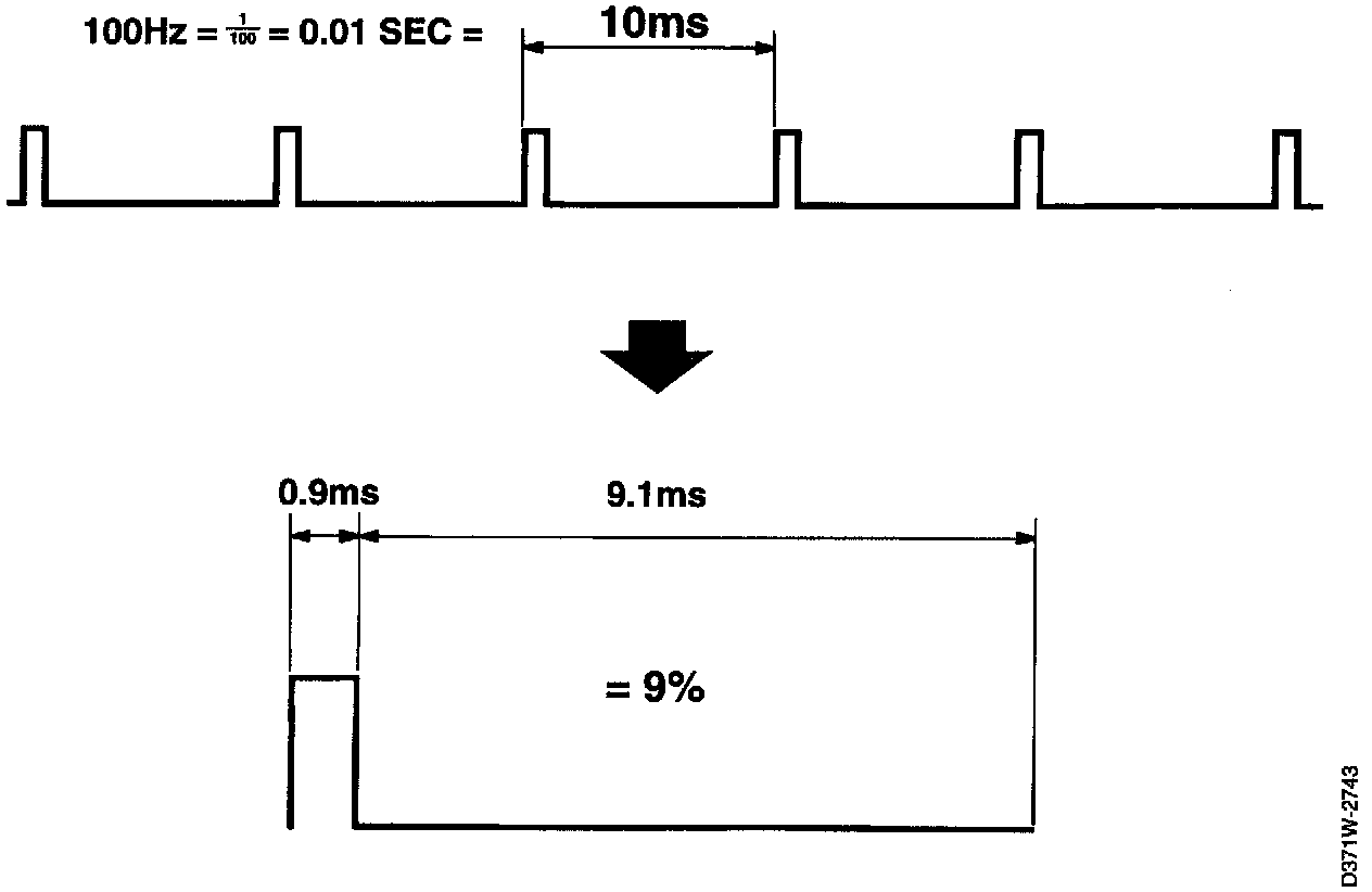At 100 Hz there are 100 pulses in 1 second, which means that the maximum pulse length is 1/100th of a second, i.e. 10 milliseconds (ms). The pulse length at 100 Hz can therefore vary between 0 and 10 ms.