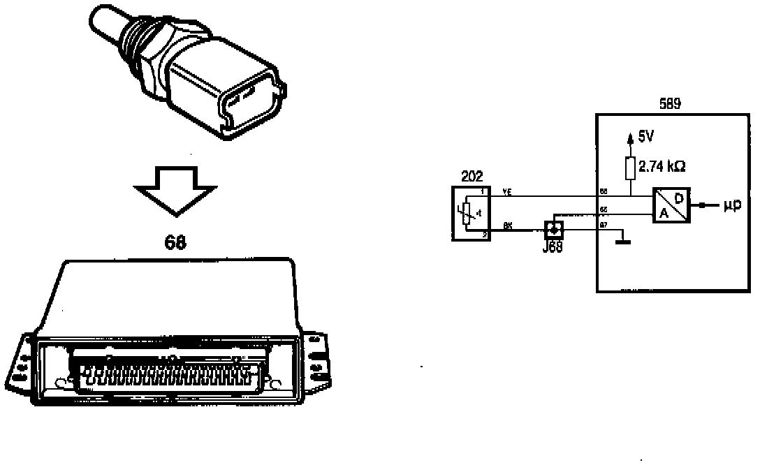 The engine control module measures the coolant temperature by applying 5 V to the sensor from pin 68 via an integral 2.74 kohm resistor. The sensor is grounded via pin 67 of the control module.
