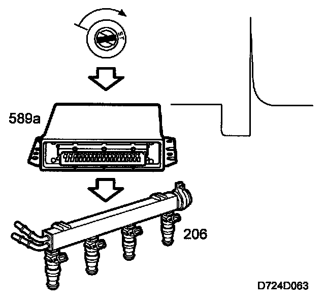 When the ignition is turned on, the main relay and fuel pump relay will be activated for a few seconds. As soon as the control module detects the crankshaft rotating, an injection that is dependent on coolant temperature takes place on all 4 injectors simultaneously. This is to obtain short starting times.