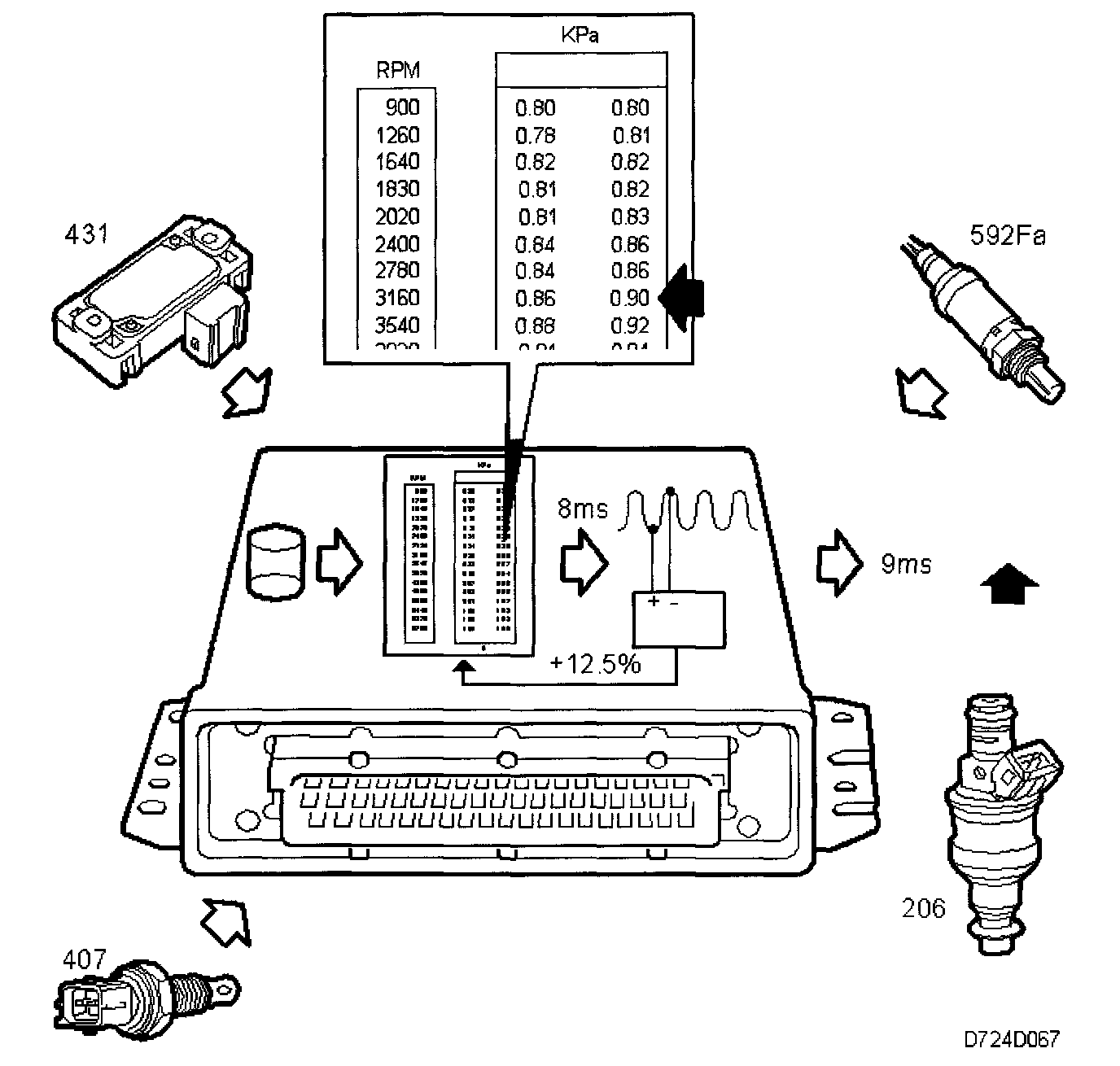 The control module first calculates the injection duration based on the pressure and temperature in the intake manifold. hhhhh injection duration is then corrected by multiplying it with a correction factor taken from the main fuel matrix, which is dependent pressure and engine speed. Injection duration must be corrected as the engine's fill factor changes with engine speed.