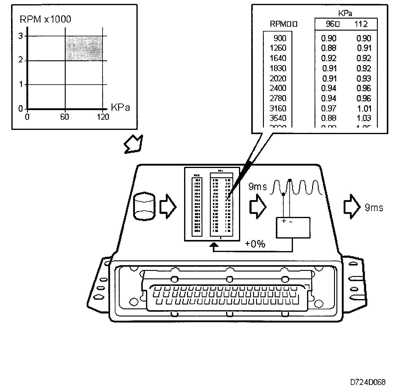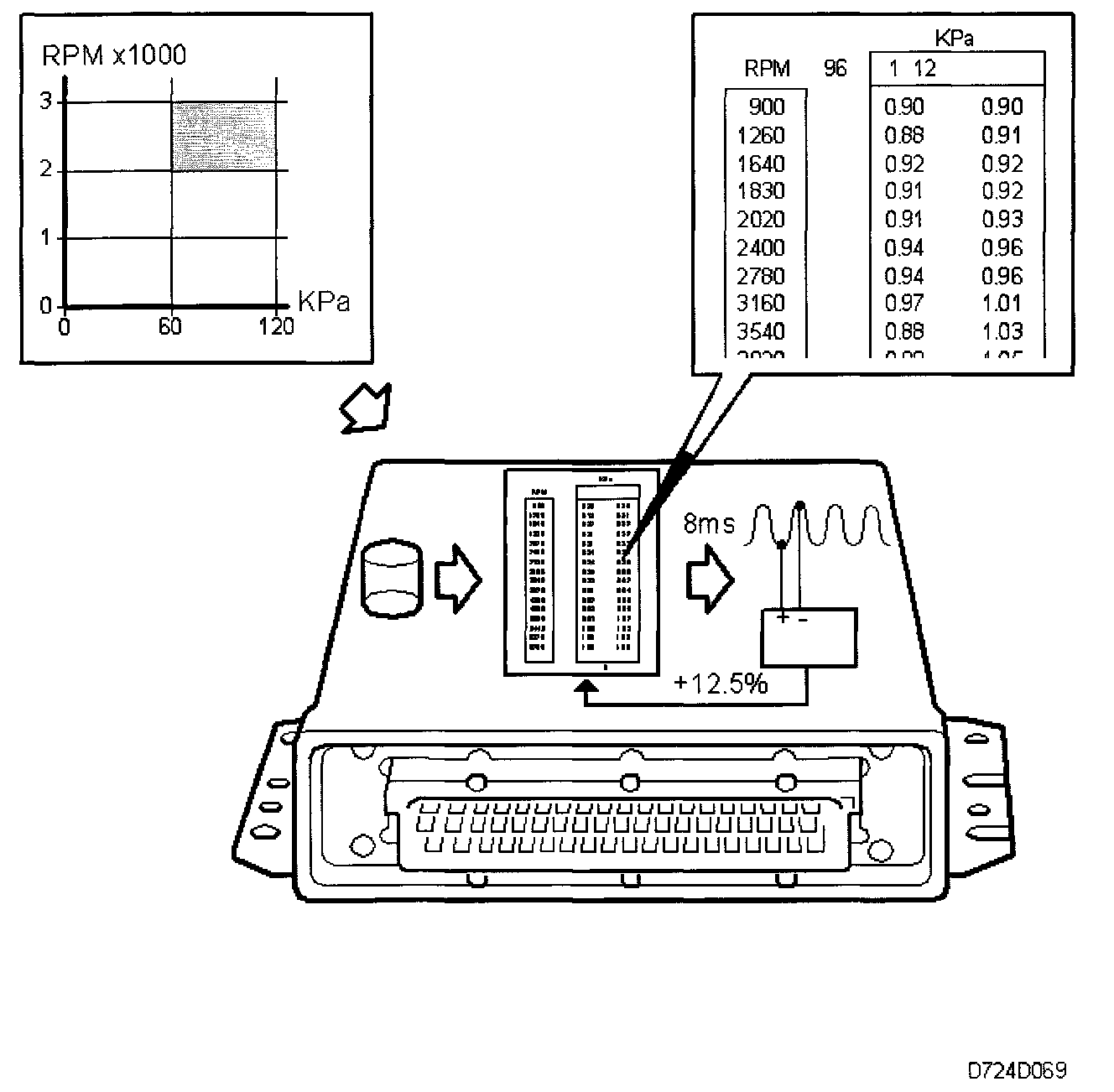 If the control module calculates injection duration to 8 ms but closed loop adjusts it to 9 ms because the fuel pressure in the car is somewhat low, the control module will "learn" the new injection duration. This is achieved by changing the correction factor for the current engine speed and load point in the main fuel matrix so that the resulting injection duration becomes 9 ms. The correction factor in this example will be increased by 9/8 (+12.5%).