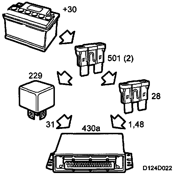 +30 is fed to the main relay and fuse 28 from maxi fuse 2. Control module pins 1 and 48 are supplied from fuse 28.