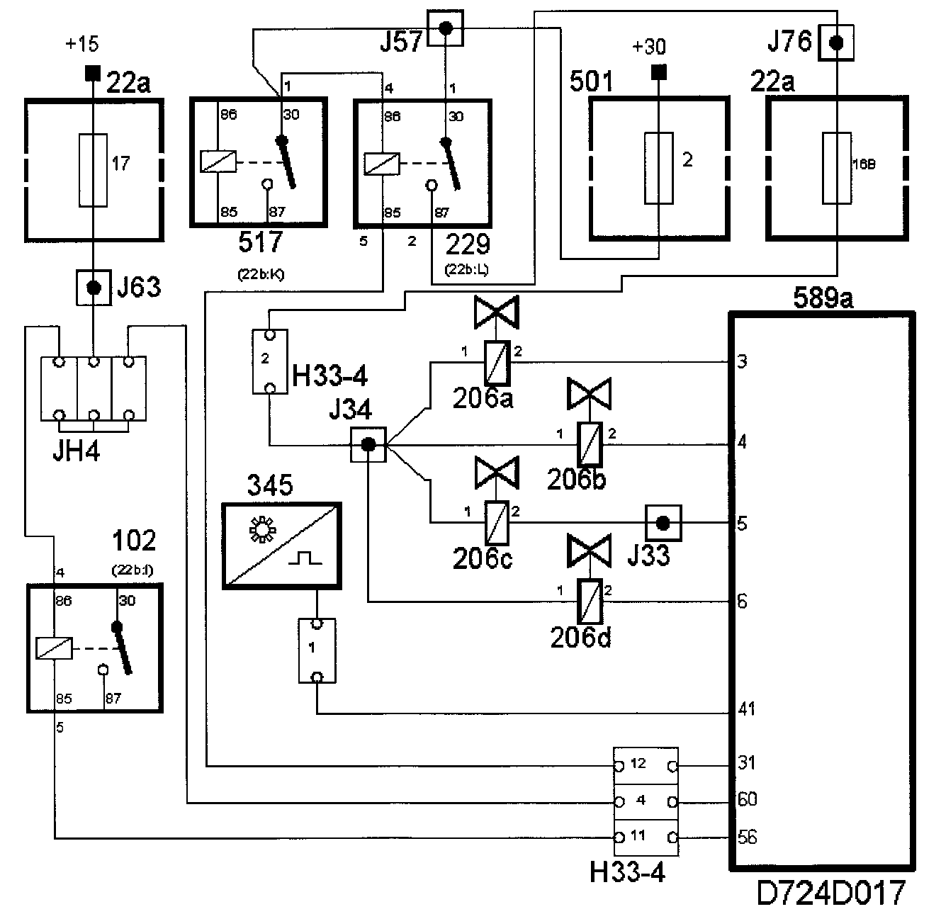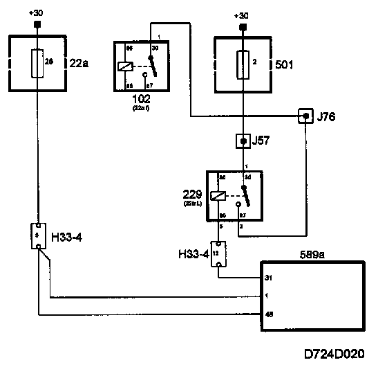 The main relay is supplied with +30 from maxifuse 2. Control module pins 1 and 48 are powered from fuse 28. The control module uses +30 for its memory.