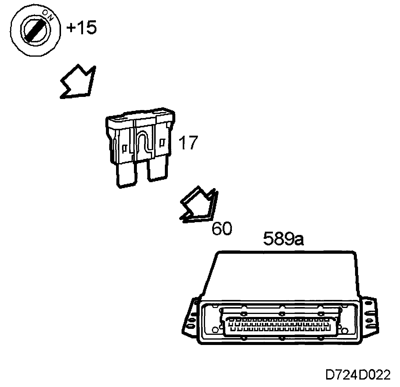 Control module pin 60 is supplied with +15 from fuse 17. When +15 is applied to pin 60, the control module will be activated.