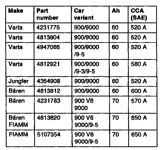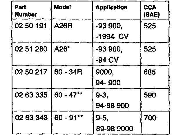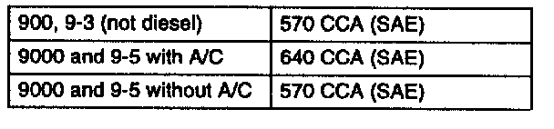 If the battery specification for cold starting current (CCA) cannot be Identified, the following standard values should be used (i.e, not originally supplied Saab battery or Interstate battery).