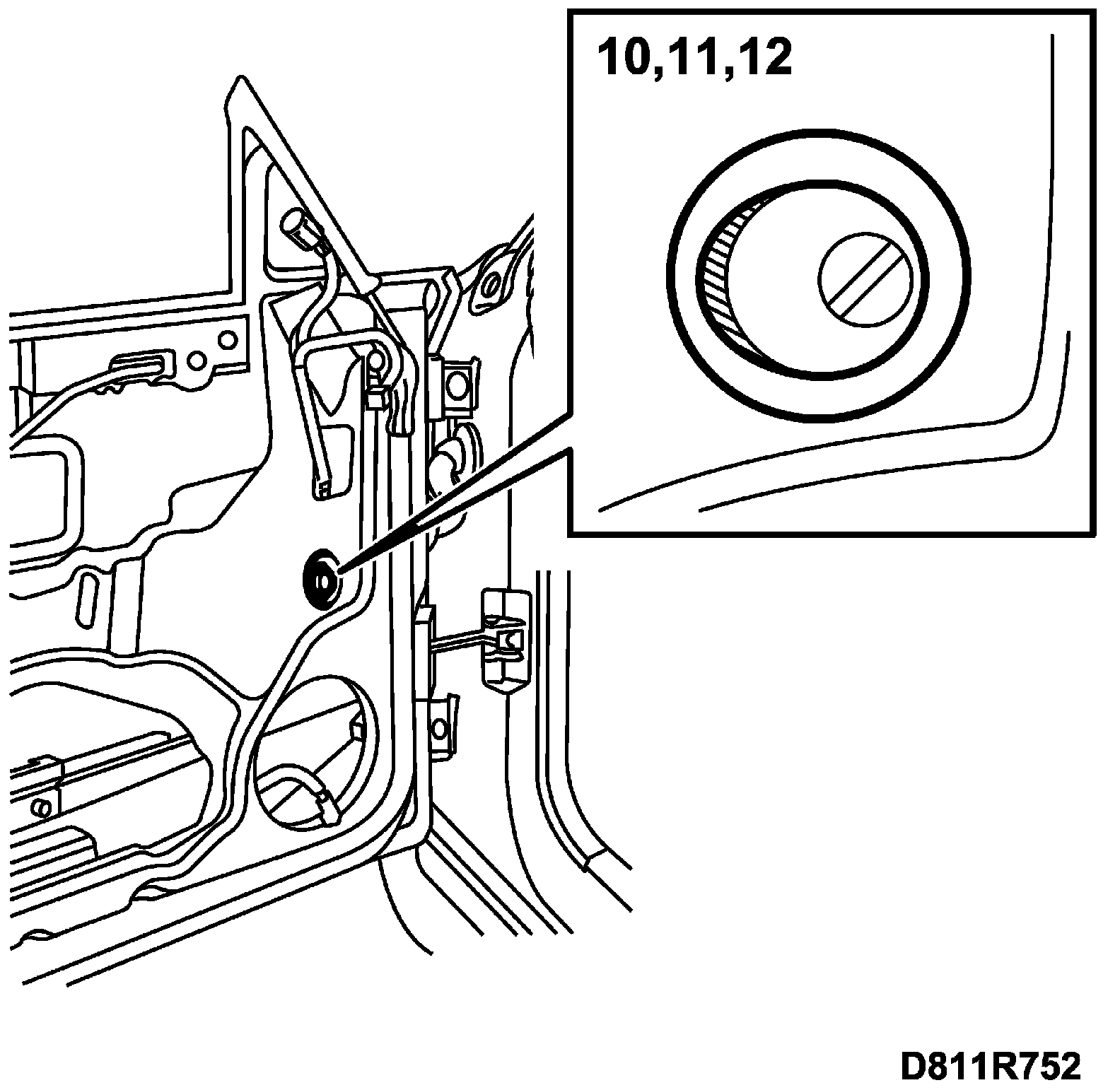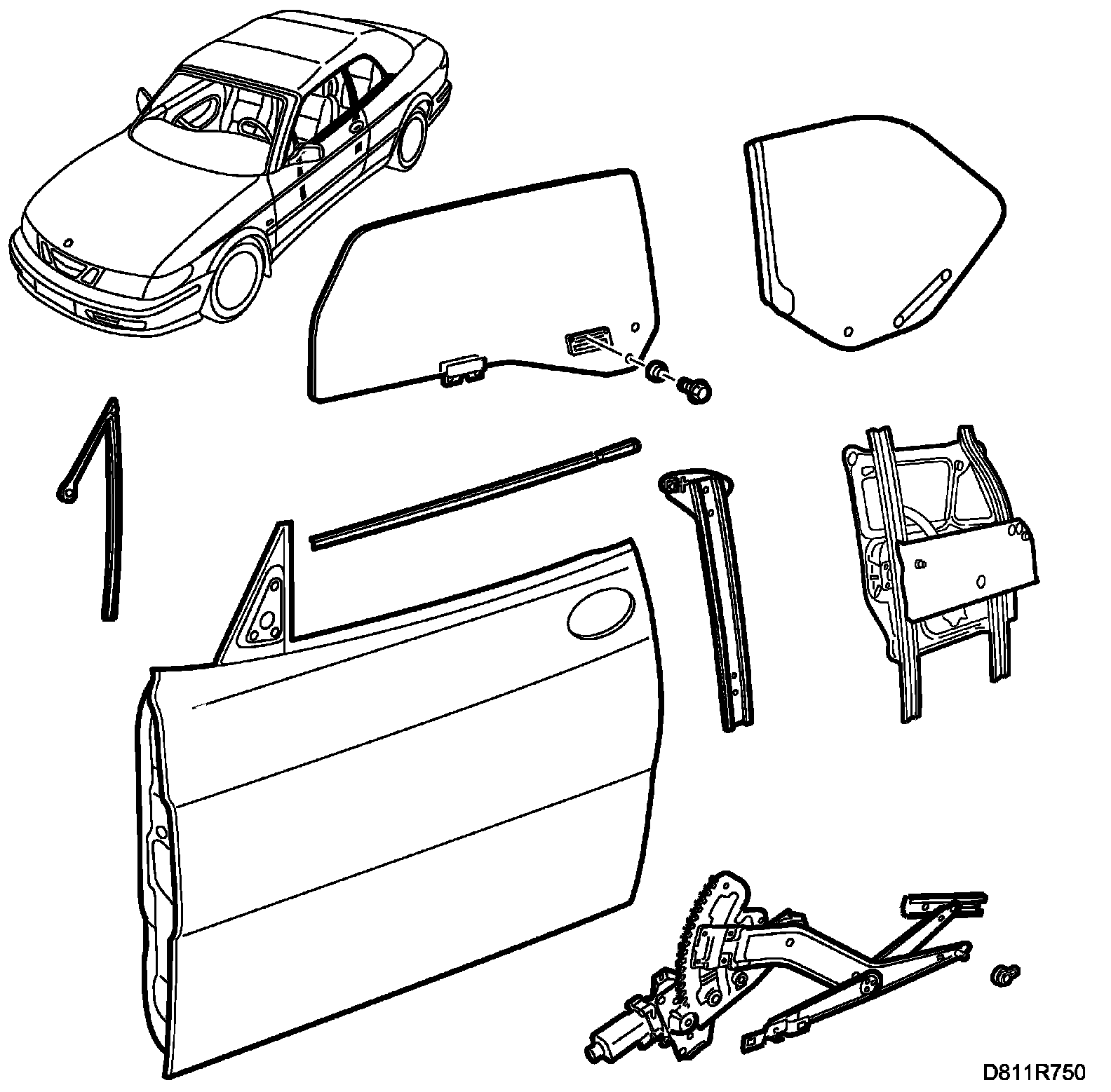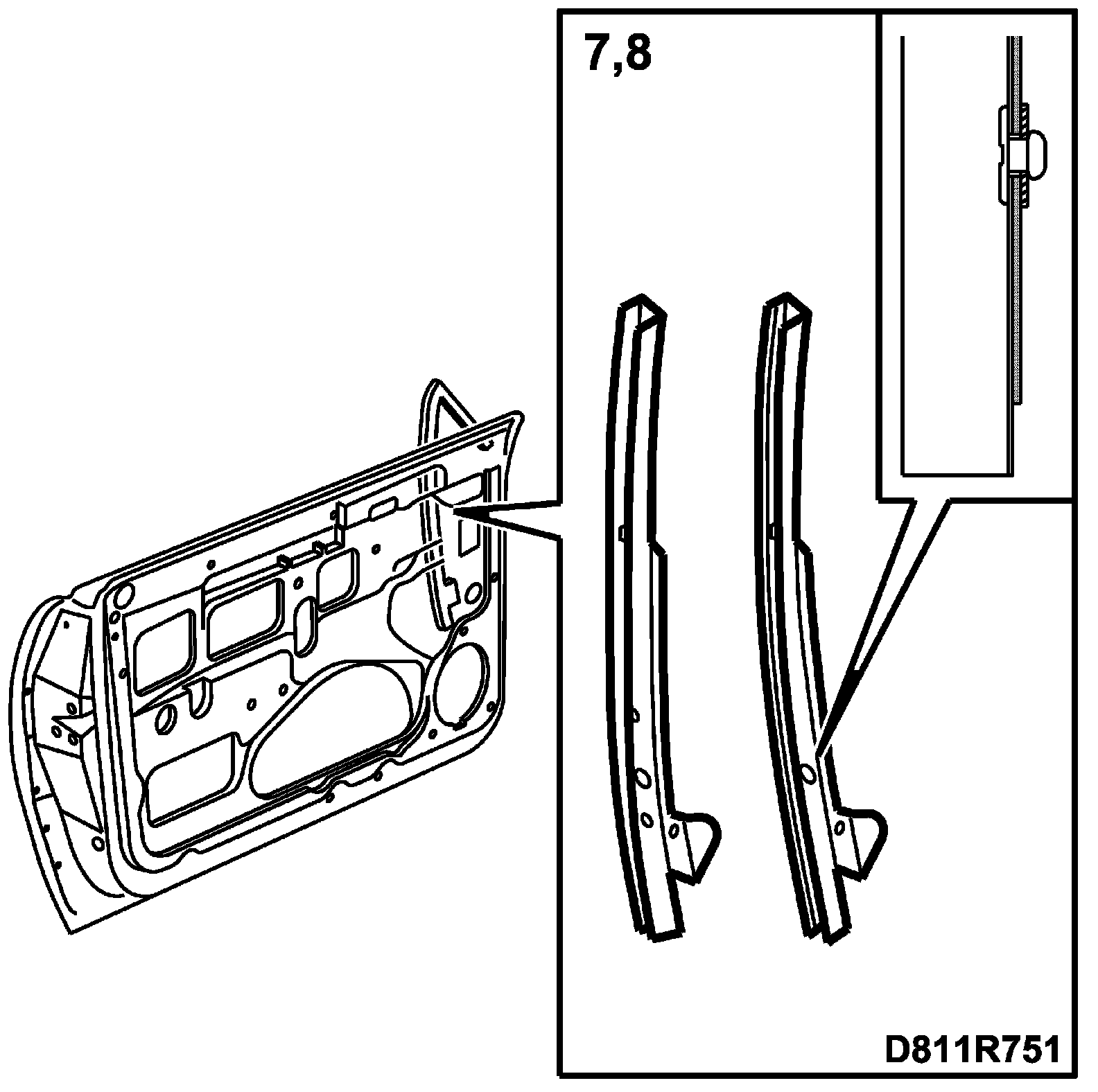 NOTE: The bushes in the door window have been changed twice, once to grey from VIN no. X7057279 and once to black from VIN no. 27016225. For cars after VIN no. 27016225 check the bushes and replace only if necessary.