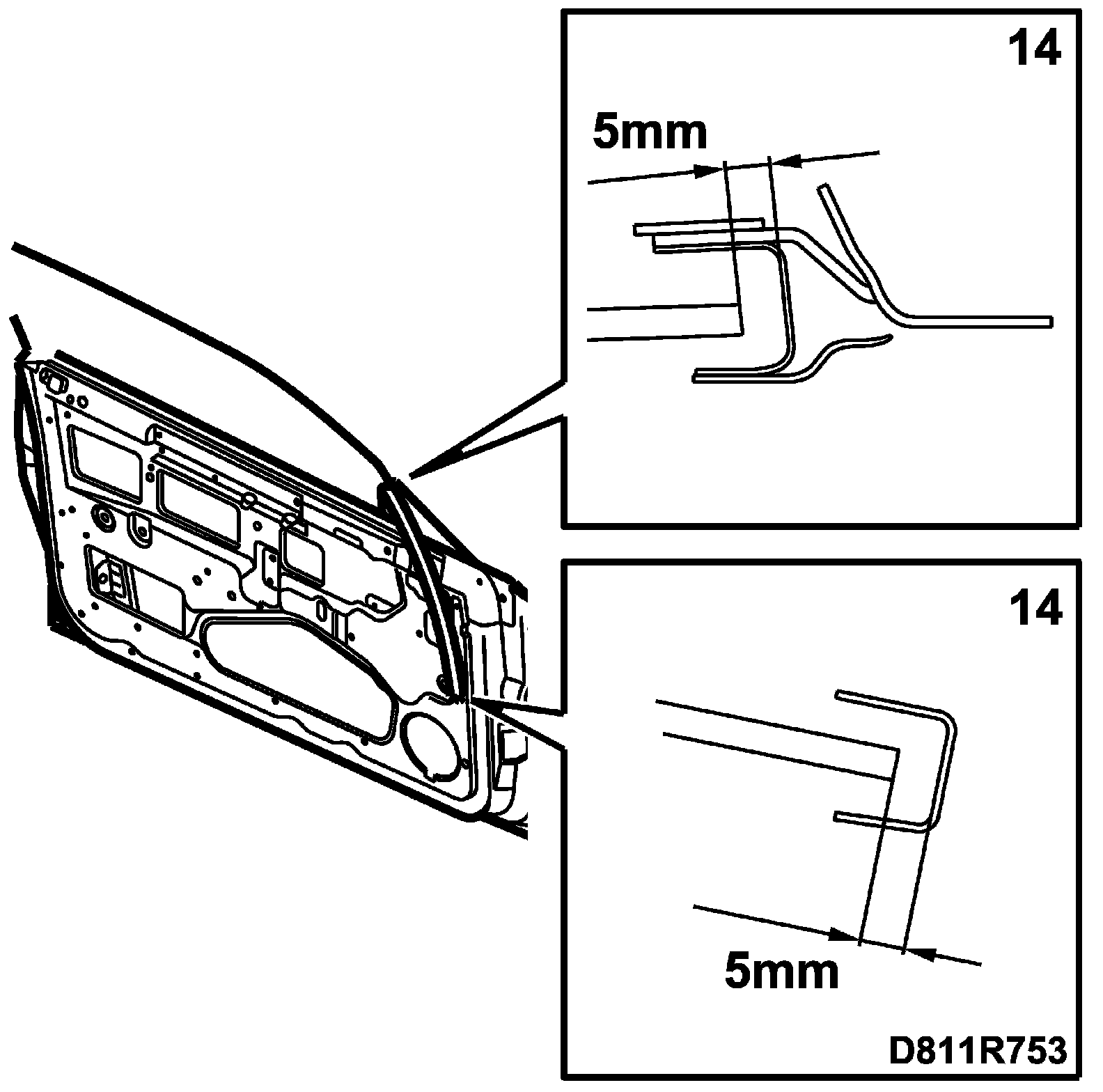 14. Fit the door window and check the tolerance to the support rail. Measure the distance from the support rail base to the front edge of the door window when the window is in its lower position. Then measure the distance with the door window raised, and measure to the upper end of the support rail. The distance should be approx. 5 mm. Measure without seals.