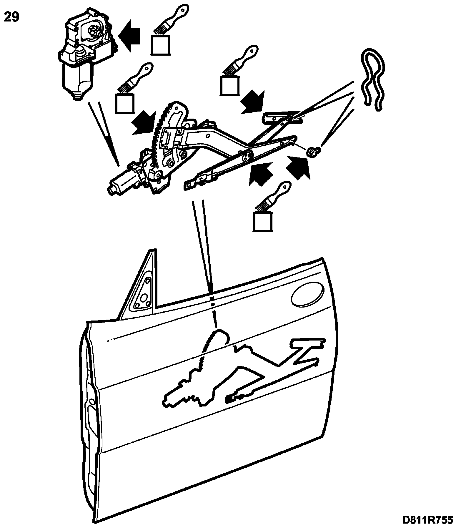 IMPORTANT: The door window bushes and vertical rear support rail must not be lubricated. Thoroughly clean away any lubricant present on the rail and bushes.