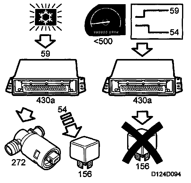 When the A/C compressor is engaged, either from the bus from ACC or with the A/C button on the dashboard, DICE will check the refrigerant pressure, evaporator temperature and coolant temperature. If all the values are acceptable, A/C ON (Bus from DICE) will be sent. MIU will then apply battery voltage to the Trionic control module pin 59.