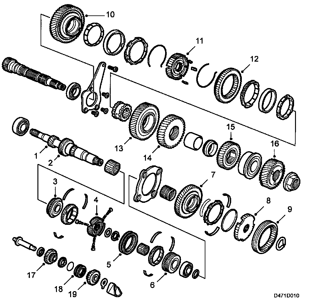 Input shaft, output shaft and reverse gear shaft