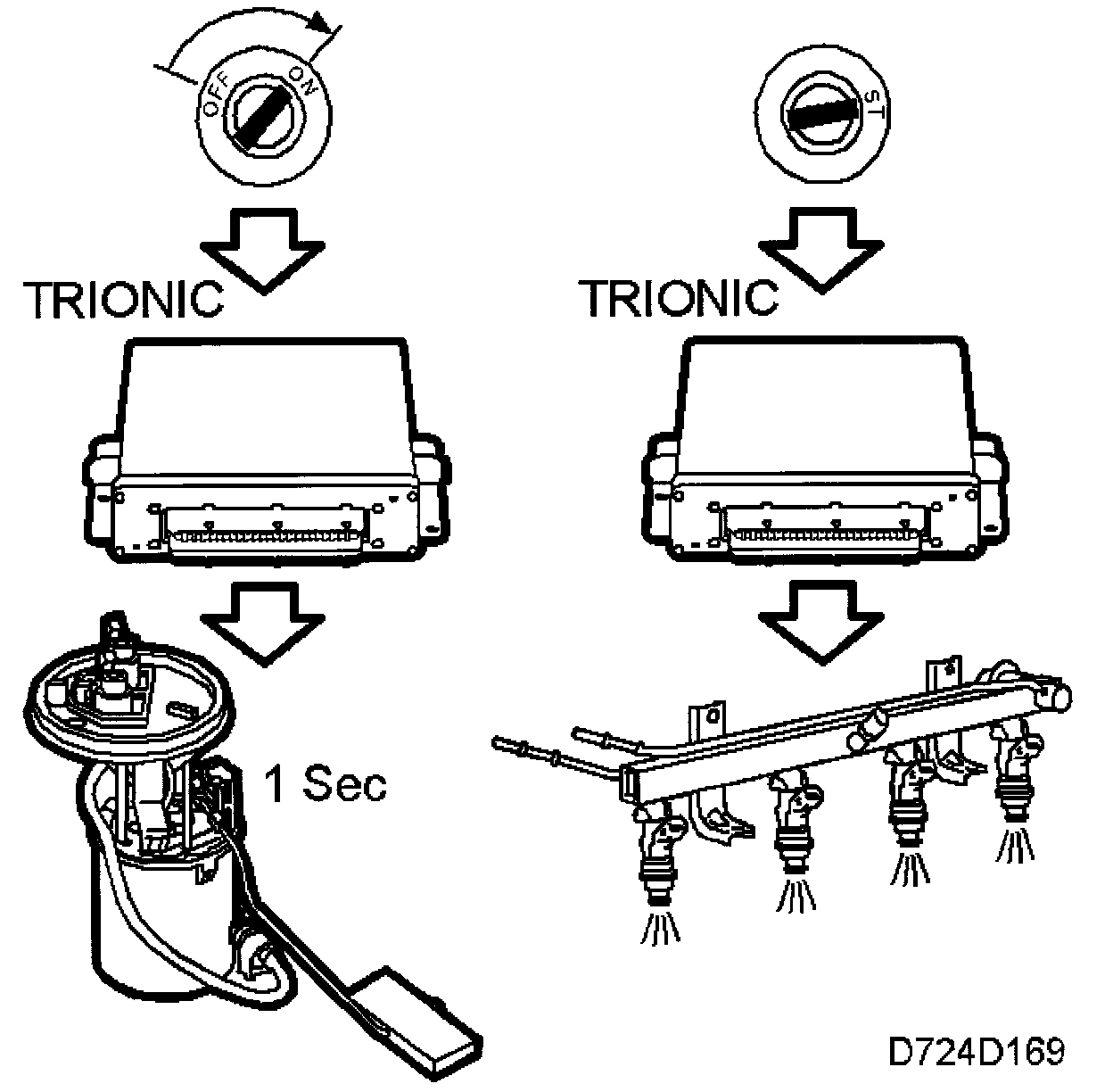 When the ignition is switched on, the control module will be activated and the CHECK ENGINE lamp will go on continuously as a function check. The fuel pump is activated for 1 second so that fuel pressure will build up, after which the control module will await pulses from the crankshaft position sensor.