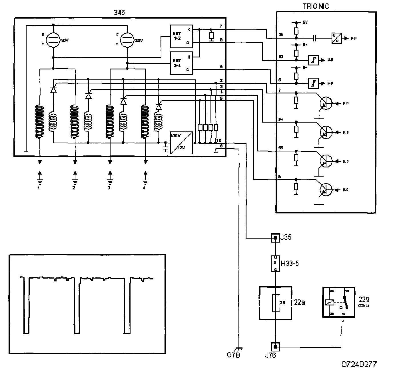 One of the poles on the secondary windings of the 4 ignition coils is connected to the respective spark plug as normal. The other pole is not grounded directly but is connected to 80V. This means that 80V is always present across the spark plug gap except just as the spark is produced.
