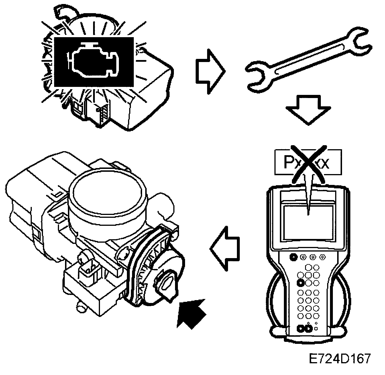 When the throttle control is in limp-home mode, the fault will be stored in the control module memory. Every time the ignition is turned on, the limp-home solenoid will be activated for 1 s and then for 4 x 0.5 s to ensure that the mechanism is not reset before the fault has been rectified. Repair must therefore be carried out in the following order: