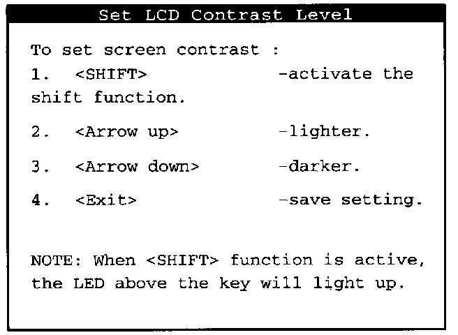 NOTE: When the desired contrast level has been set, the "Shift" function must be deactivated by pressing the "Shift" key again so that the lamp above it goes out. If this is not done the "SHIFT' function will continue to lock the keypad.