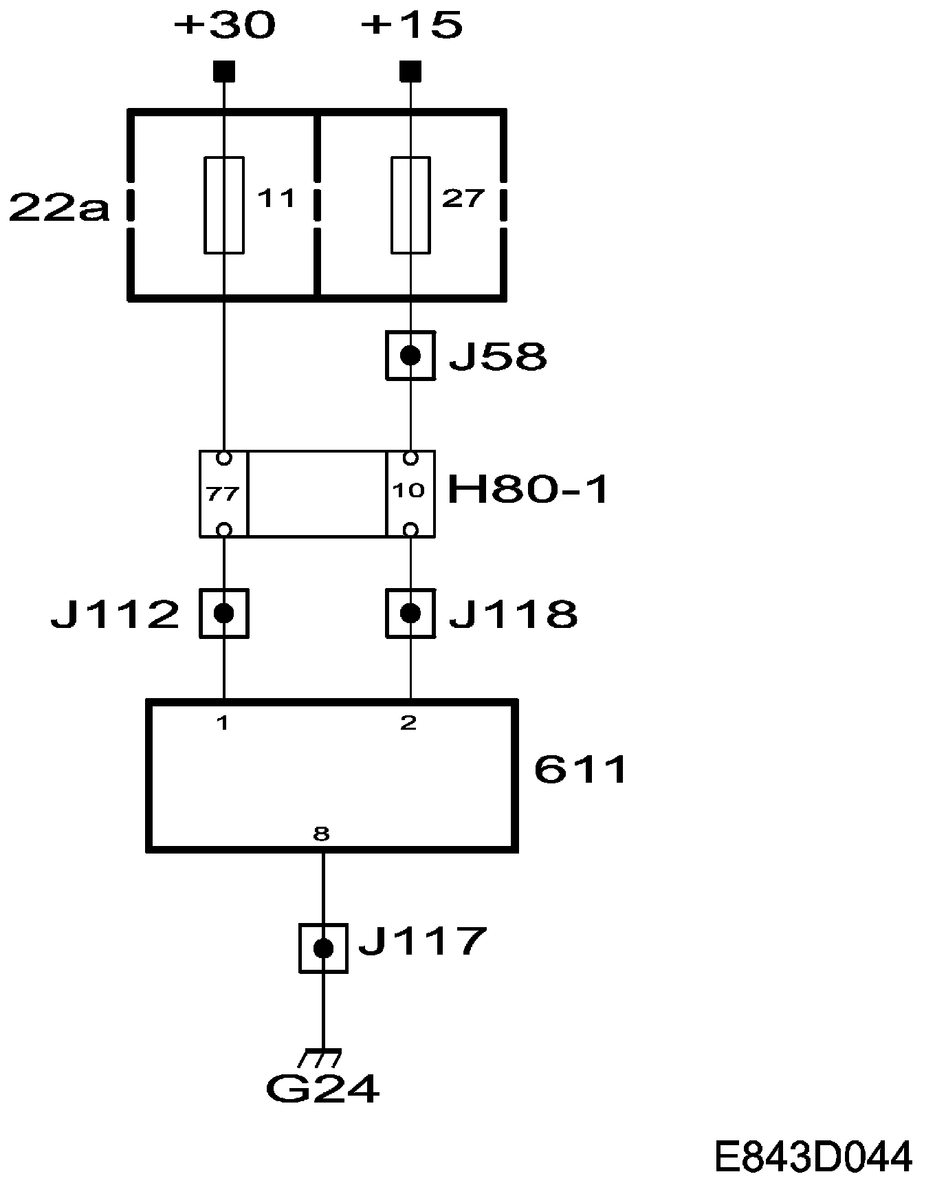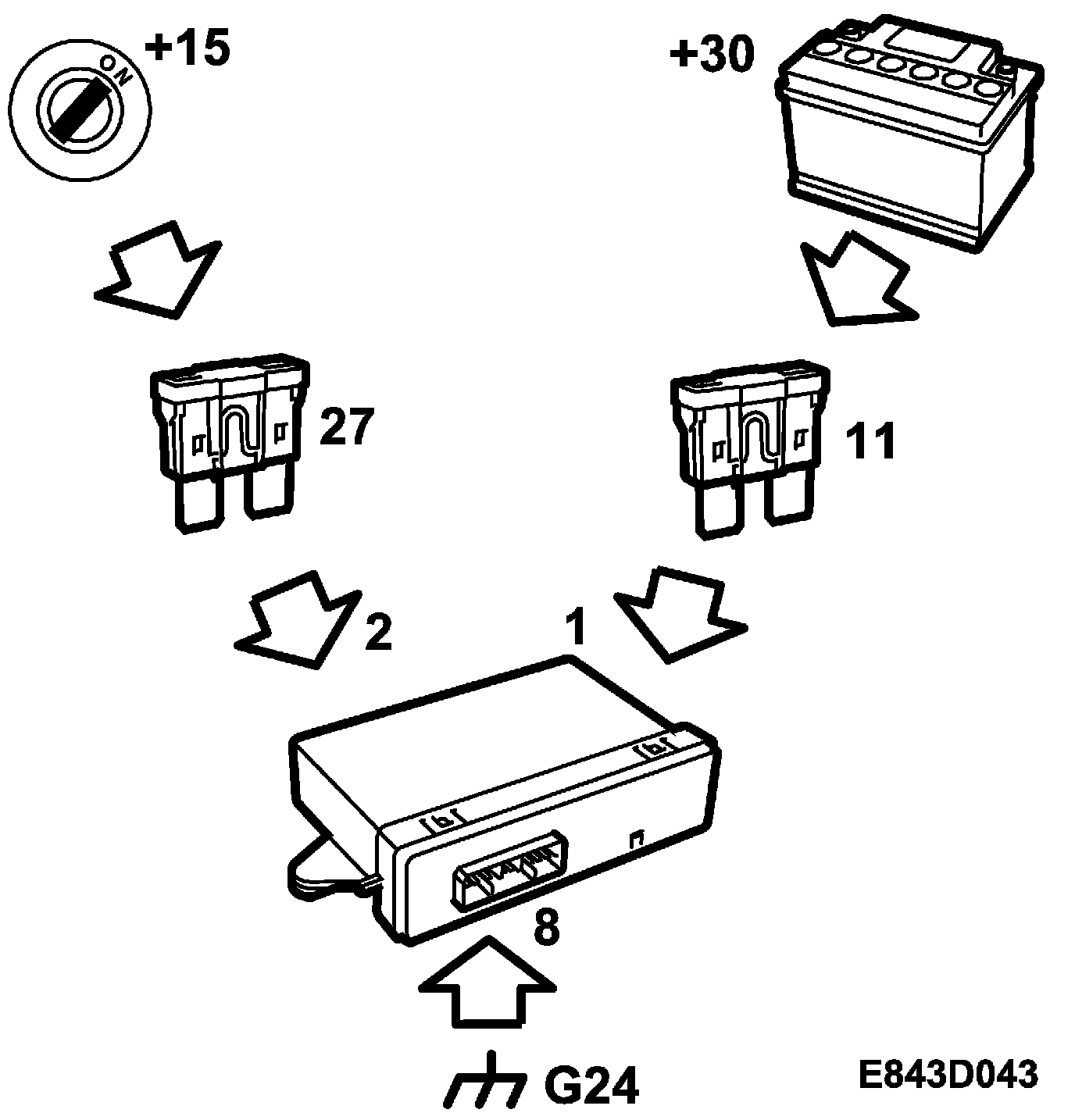 + 30 power supply, fed via fuse 11 to control module pin 1.