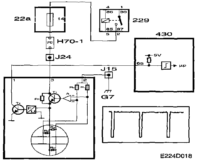 If RH is cooled by an air current its temperature will be immediately restored by a higher current through transistor T1. The voltage required to maintain RH's resistance at a constant level is supplied to a frequency converter which in its turn controls transistor T2. T2 grounds the control module input with a frequency corresponding to the mass air flow. The ground pulses have a duration of 40 micro sec.