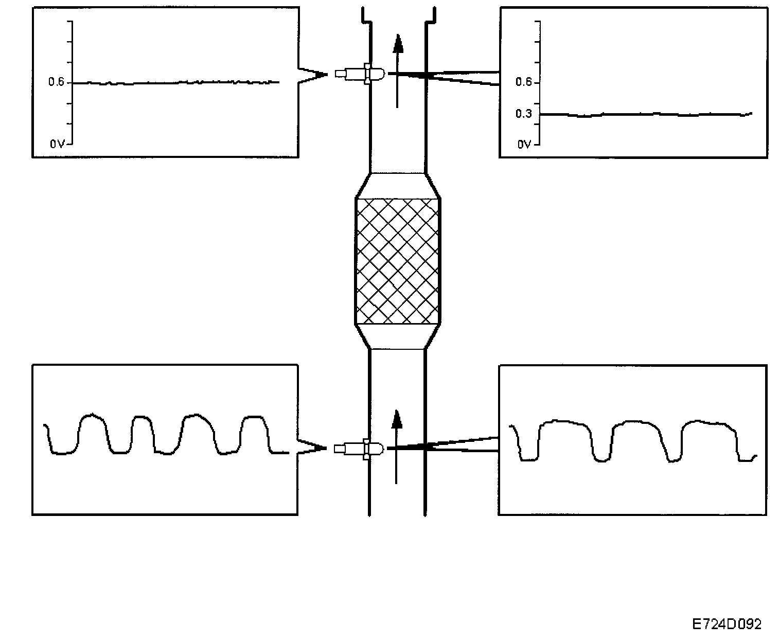 If the catalytic converter is damaged, its ability to absorb oxygen will deteriorate. The normal fluctuations of the closed loop will then be detected on the voltage from oxygen sensor 2 and a diagnostic trouble code will be generated. The diagnosis is performed once per driving cycle.