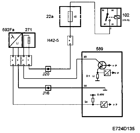 To be able to quickly supply voltage after starting, the oxygen sensor must be preheated. Preheating is fed with B+ from the fuel pump relay via fuse 15 and is grounded via control module pin 49. To be able to regulate the preheating, the grounding of the preheating circuit is pulse width modulated.