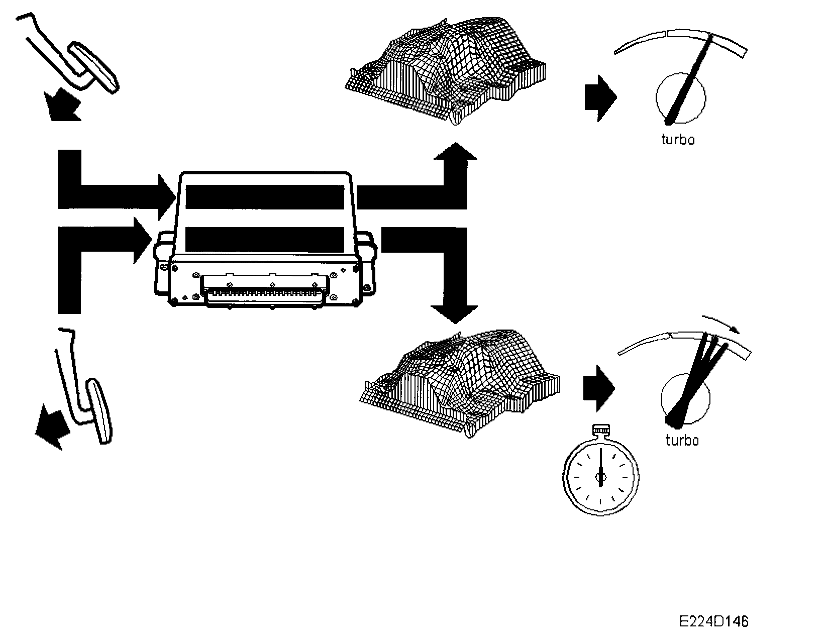 The overboost function enables the engine torque to be higher than the normal values programmed in the Trionic control module memory. The normal value is max. 350 Nm in the speed range 1900-4000 rpm, but during powerful acceleration when the overboost function is activated, the control module will change to another value that allows a higher max. torque (370 Nm in the same speed range). The overboost function gives an increase in torque in all speed ranges, although the increase is greatest in the range 1900-4000 rpm.