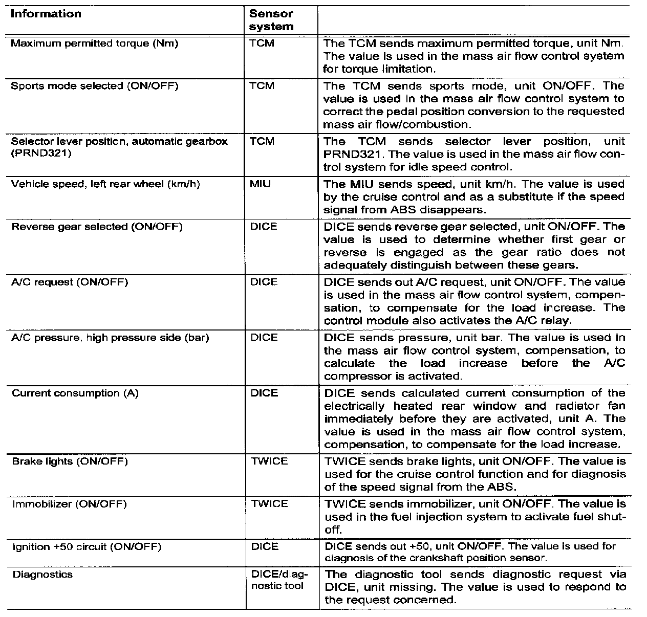 The Trionic and TCM control modules continuously check that all control modules from which they receive information are in proper communication. Intermittent bus communication faults will cause diagnostic trouble codes to be generated in the Trionic T7 and TCM control modules. The cause of the fault may be that the supply of current to the control module concerned has failed or that one of the bus leads is broken or disconnected.