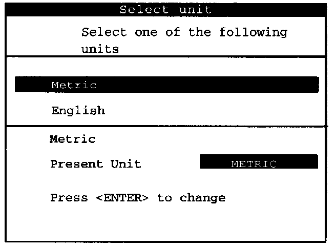 English or metric units can be selected by marking the desired setting and then pressing "ENTER" to change the setting. The selected setting will be saved and displayed next time the Tech 2 is used.