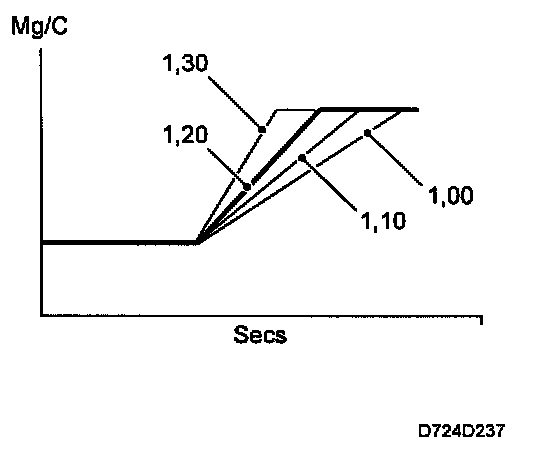 Immediately after starting the engine, the correction factor is slightly over 1 and then falls gradually to 1.00. The extent to which the correction factor exceeds 1 and the time it takes to reach 1.00 again depend on the coolant temperature. On cars with carburettor engines, this function is the choke. The closed loop control system's starting conditions are such that it starts just when fuel enrichment after starting has dropped to 1.00.