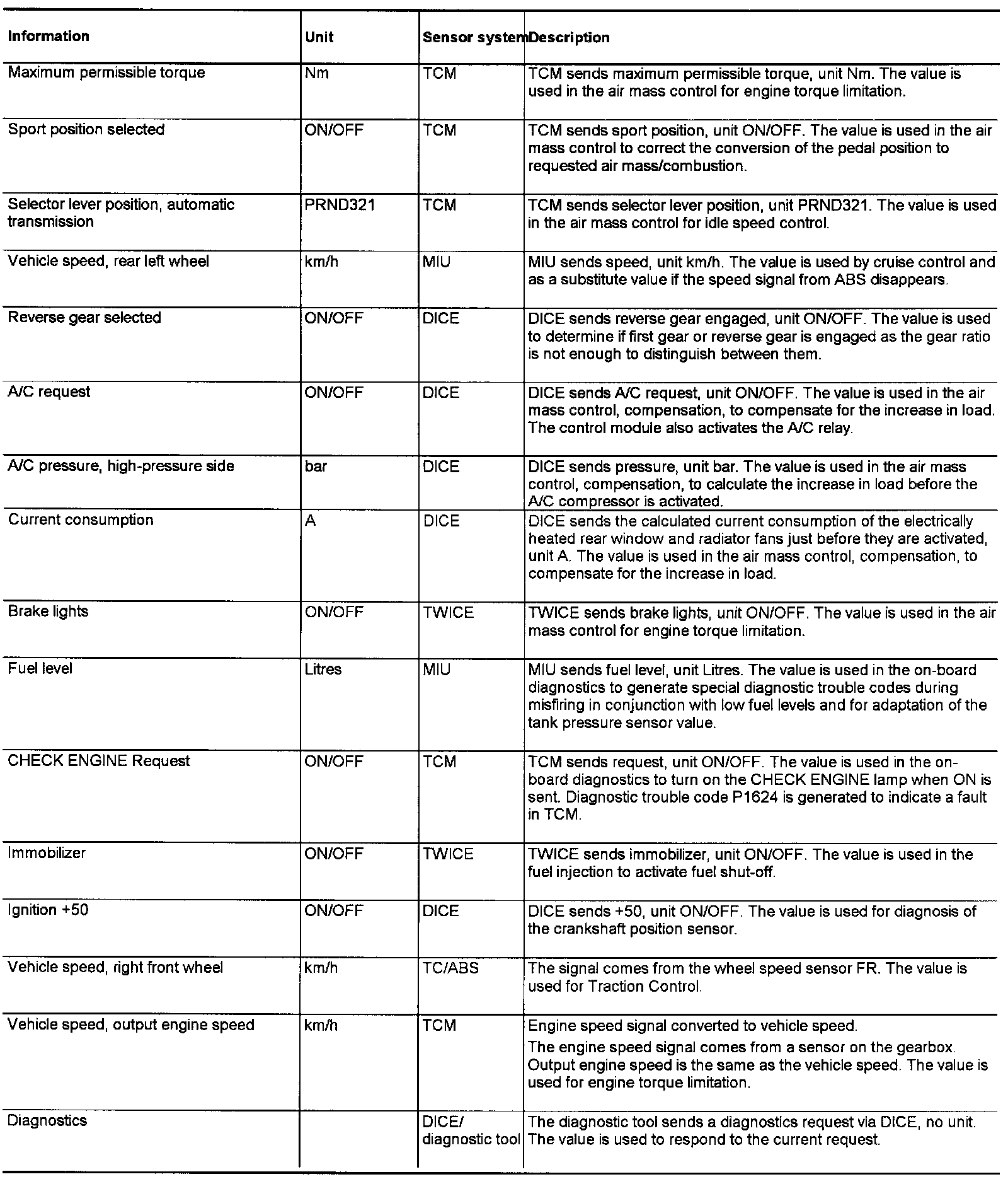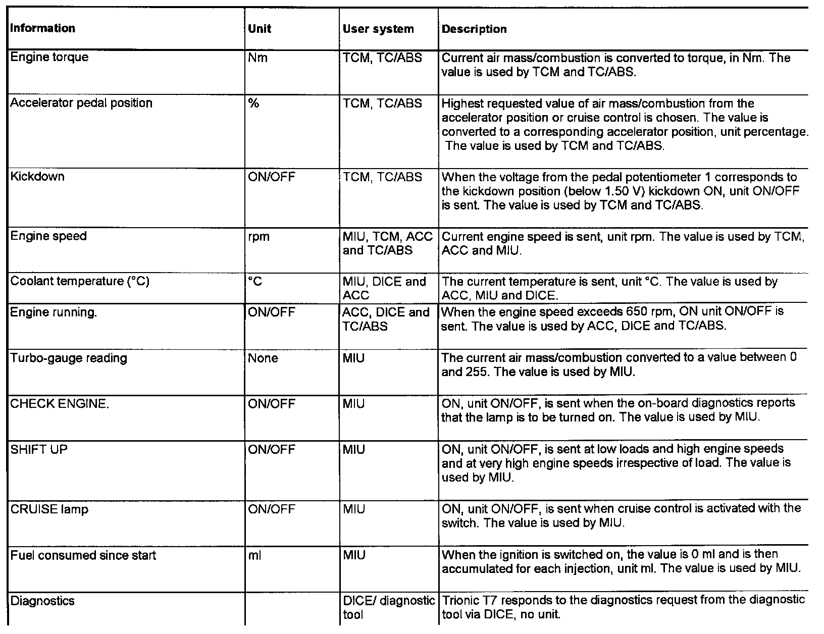 Trionic T7 transmits the following information: