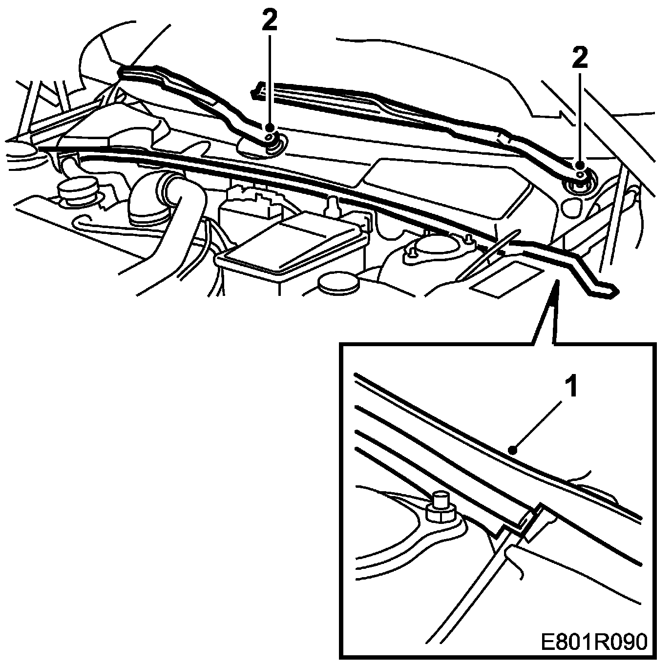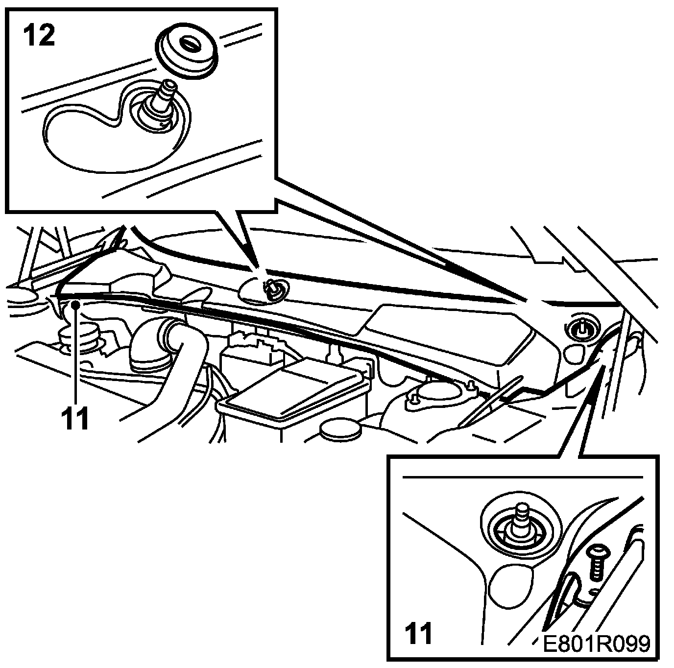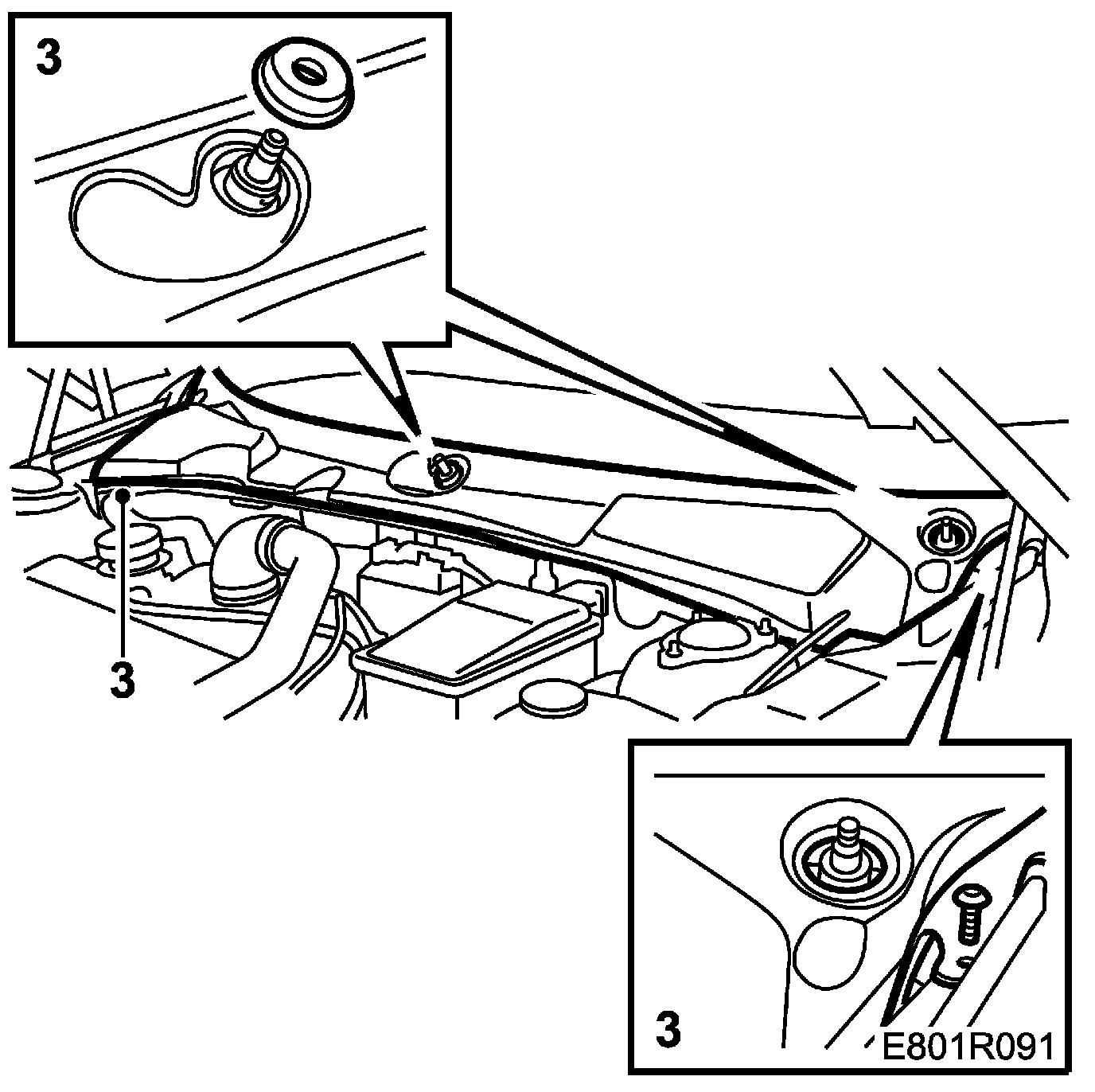 3. Remove the rubber seals and the bolts holding the cover of the bulkhead partition space. Remove the cover by lifting the front edge and then pulling forward so that the clips release from the edge of the windscreen. The lift it rearwards and remove it.