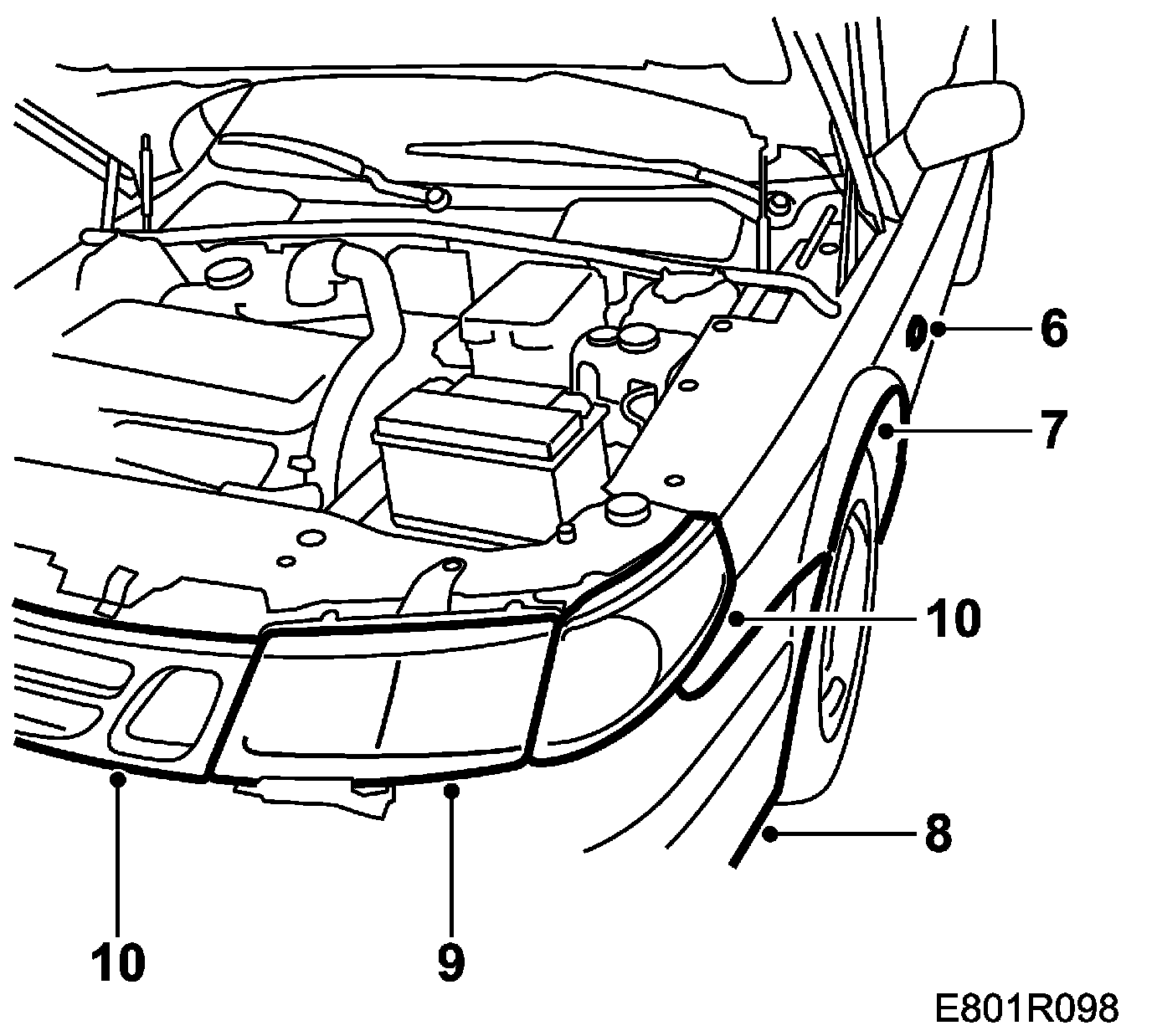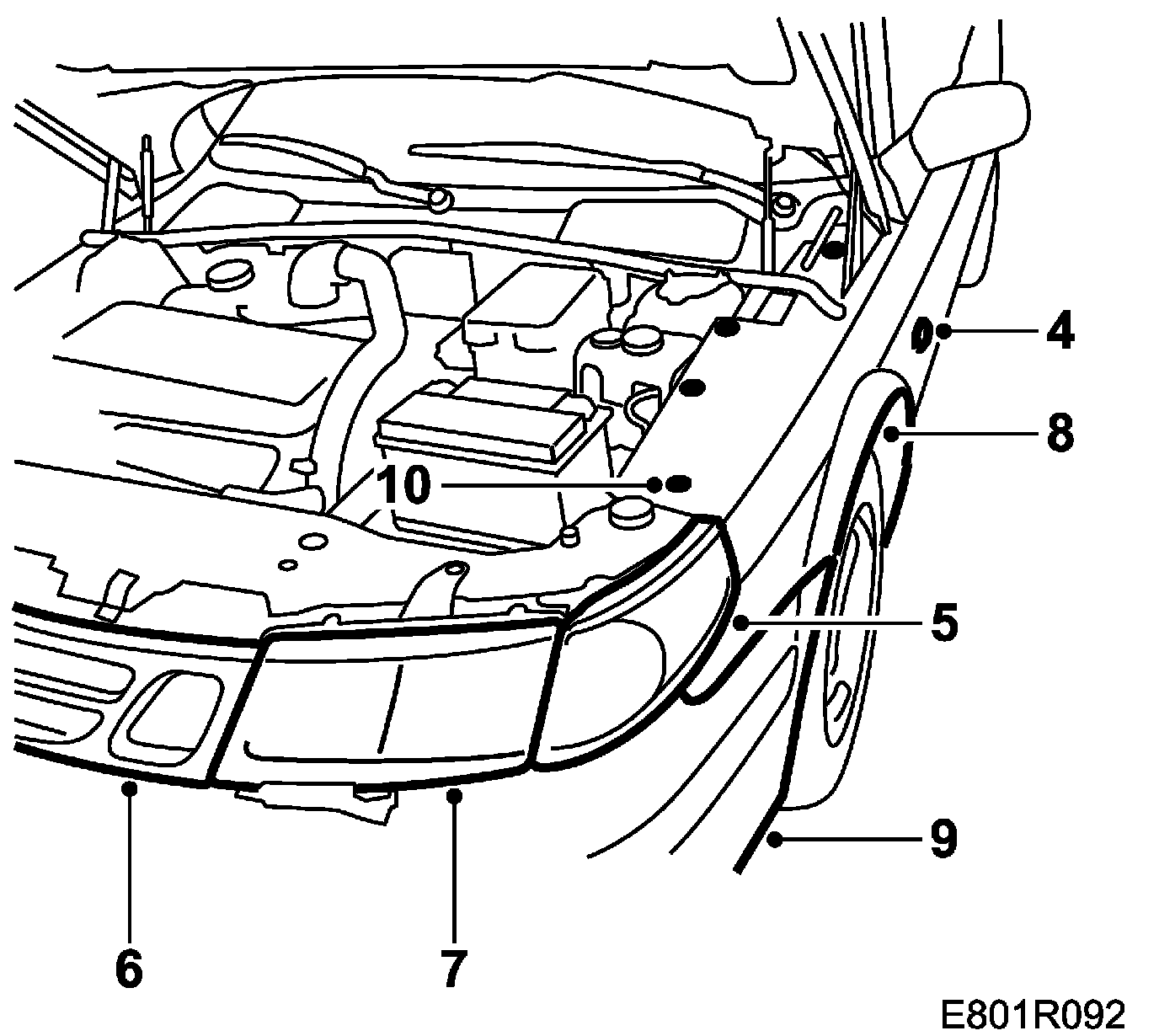 1. Remove the rear bonnet seal from the front wing.