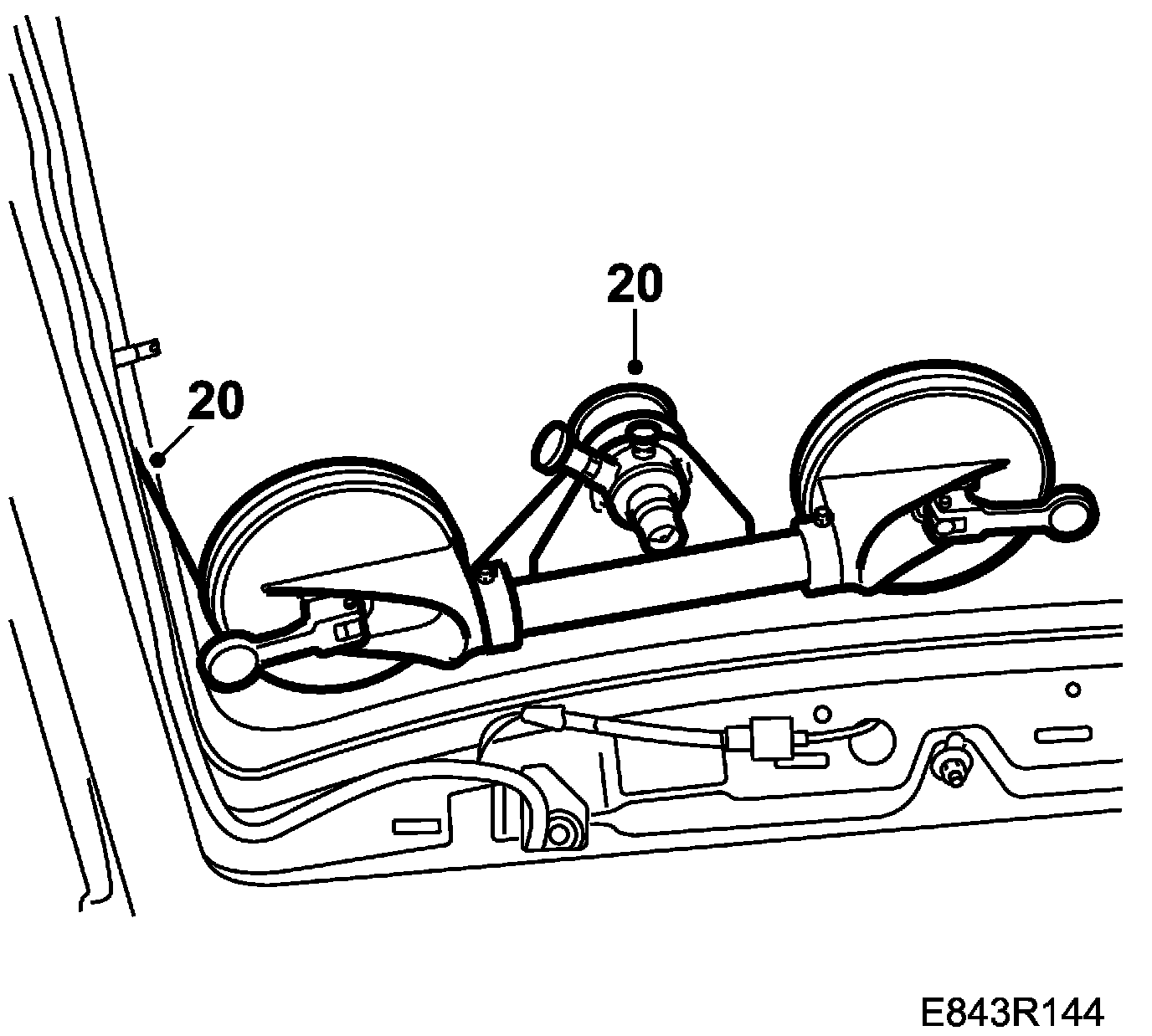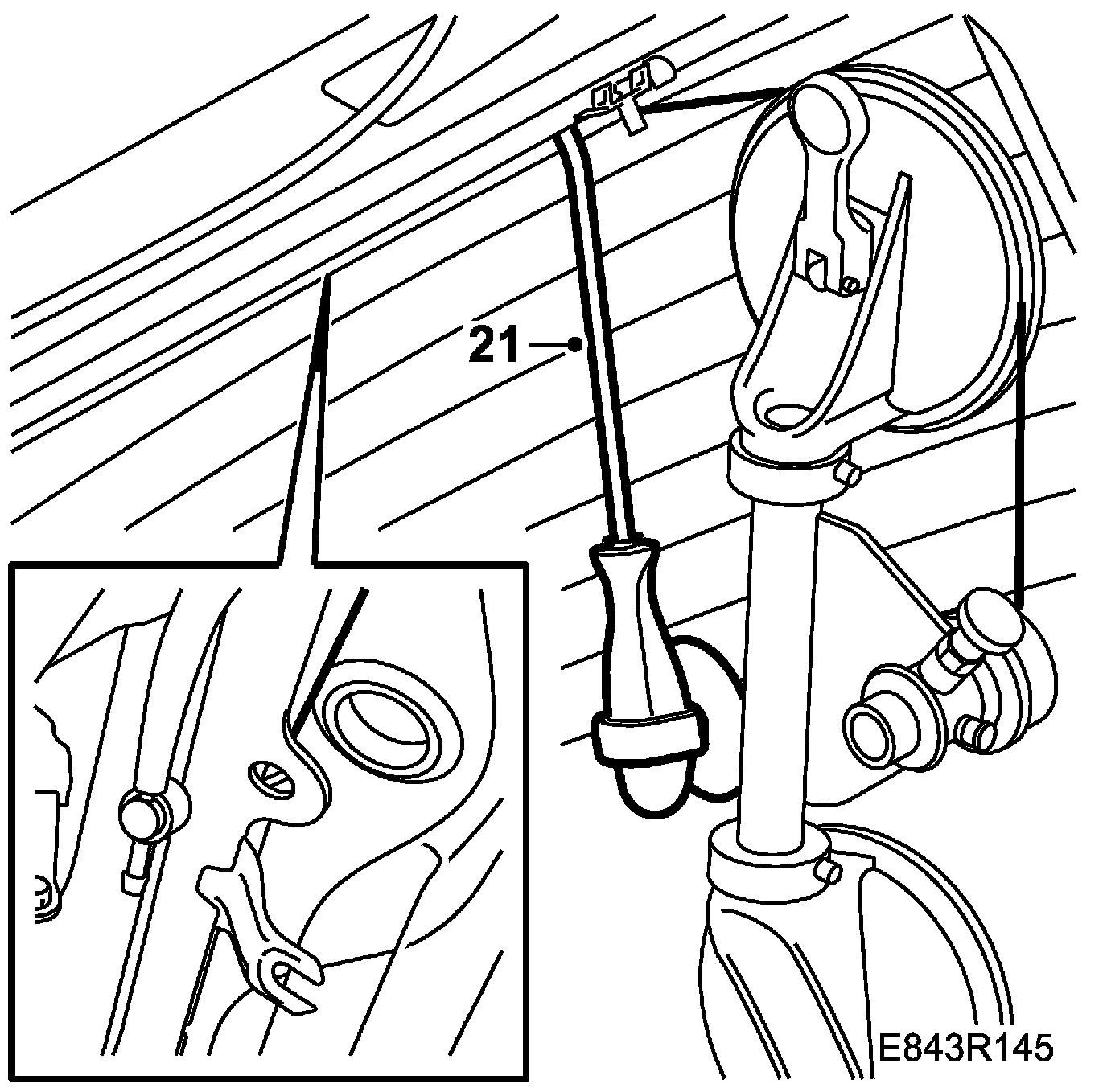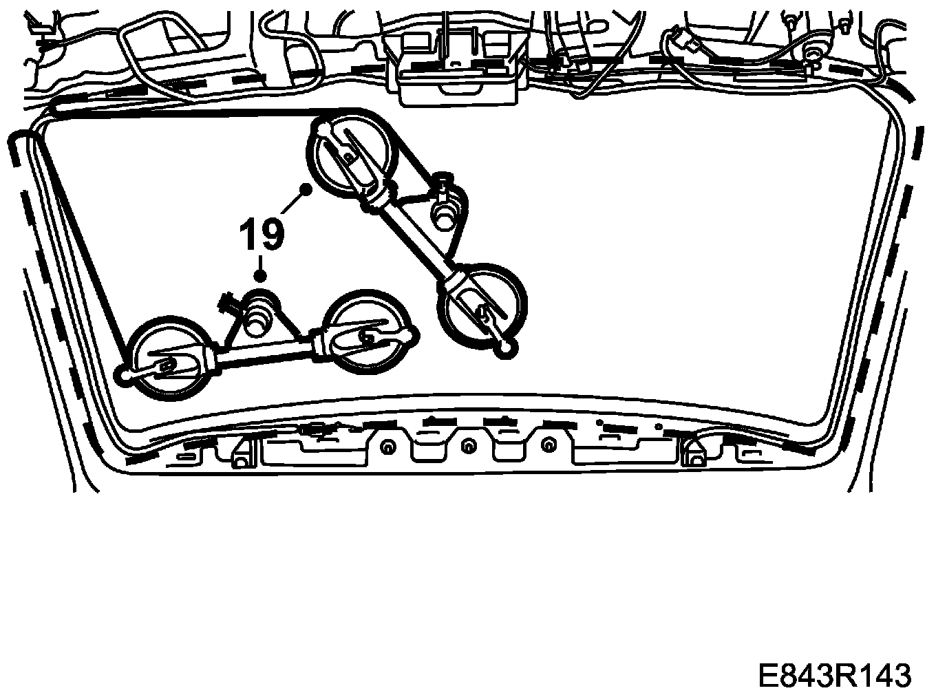 12. When replacing glued windows, use 82 93 714 Kit, window removal tool. If the window is so damaged that the suction cups do not adhere, use 30 14 099 Handle for cutting wire and saw out the window with the help of a co-worker.