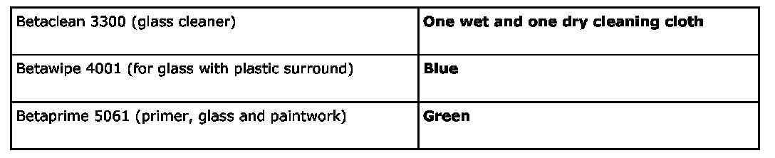 8. Carefully wash the edges of the window with Betawipe 3300. Carefully wipe the edges using the wet cleaning cloth. Dry with the dry cleaning cloth provided in the adhesive kit. Avoid touching the cleaned surface.