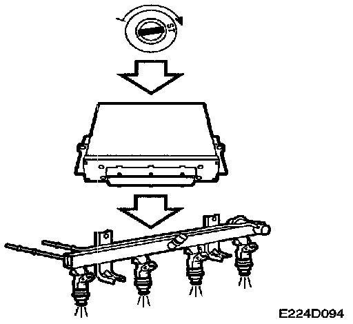As soon as the control module detects that the crankshaft has begun to turn, simultaneous injection takes place at all four injectors. The quantity of fuel injected depends on the coolant temperature.
