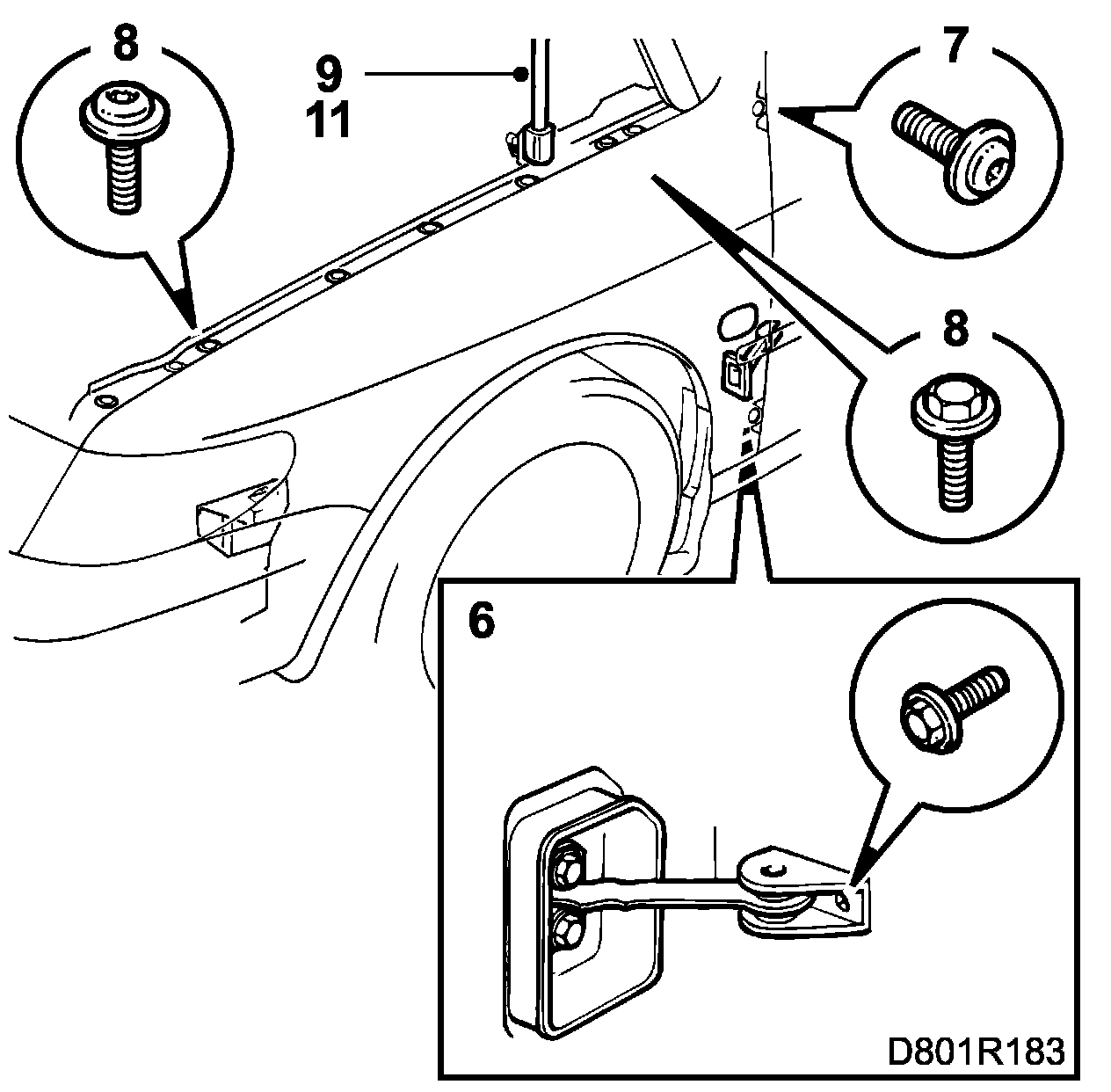 2. Remove the retaining screw that secures the front edge of the wing to the inside of the wheel housing.