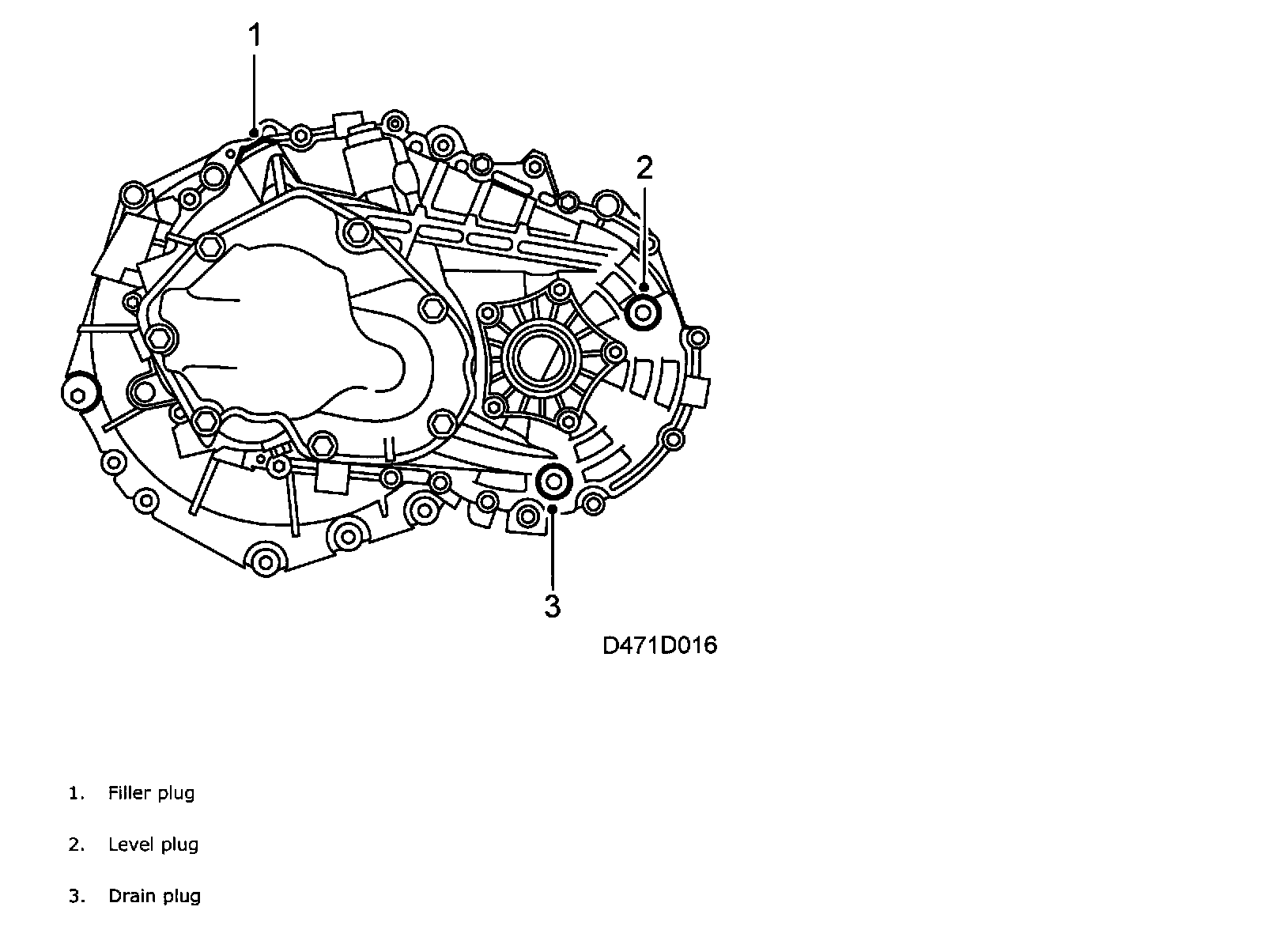 The gearbox has 3 plugs; one filler plug (1), one level plug (2) and one drain plug (3). When working on the gearbox, the plugs are used when oil is to be drained. To check the level or top up with oil, the level plug is removed and oil filled until it runs from the level plug. Note that the drain plug contains a magnet. Apply thread sealant to the plugs before removing them. A "dry" gearbox holds 1.9 liters of oil.