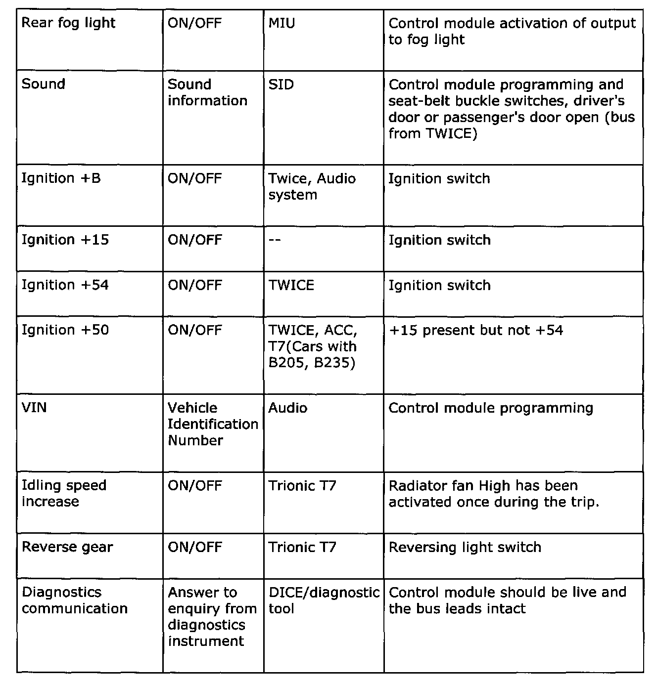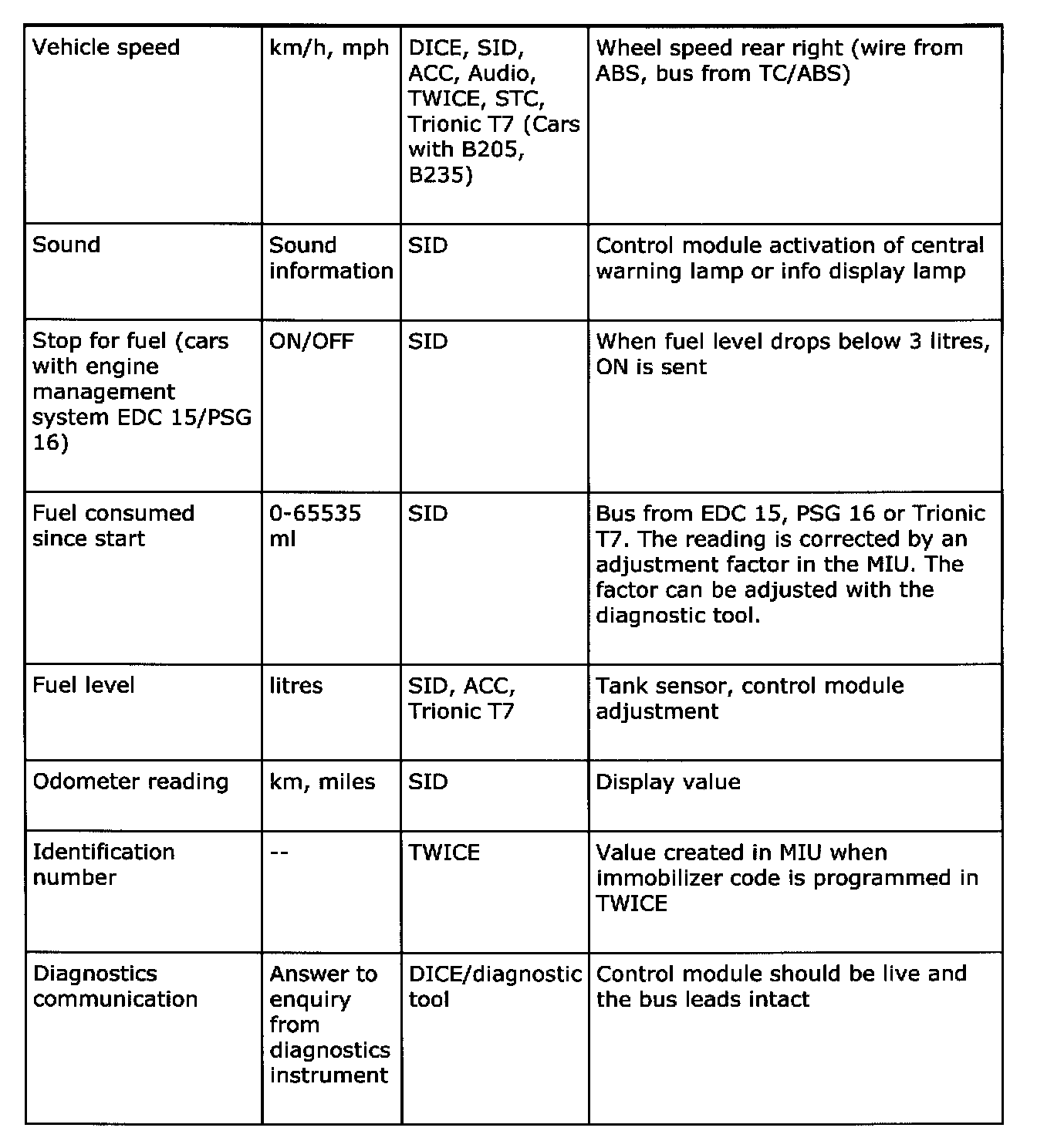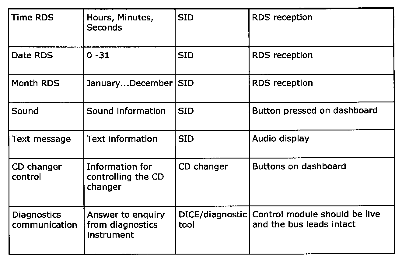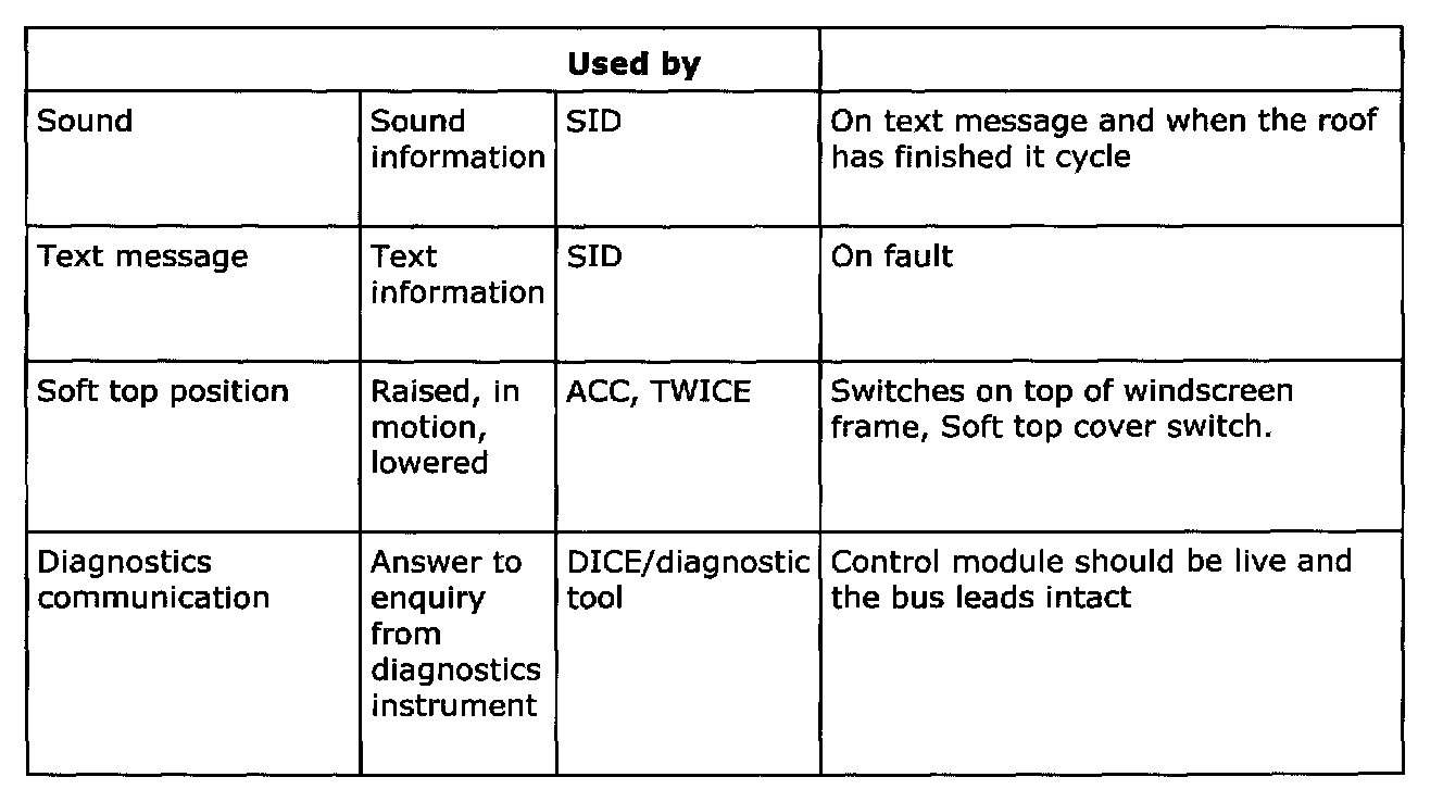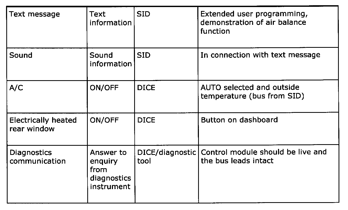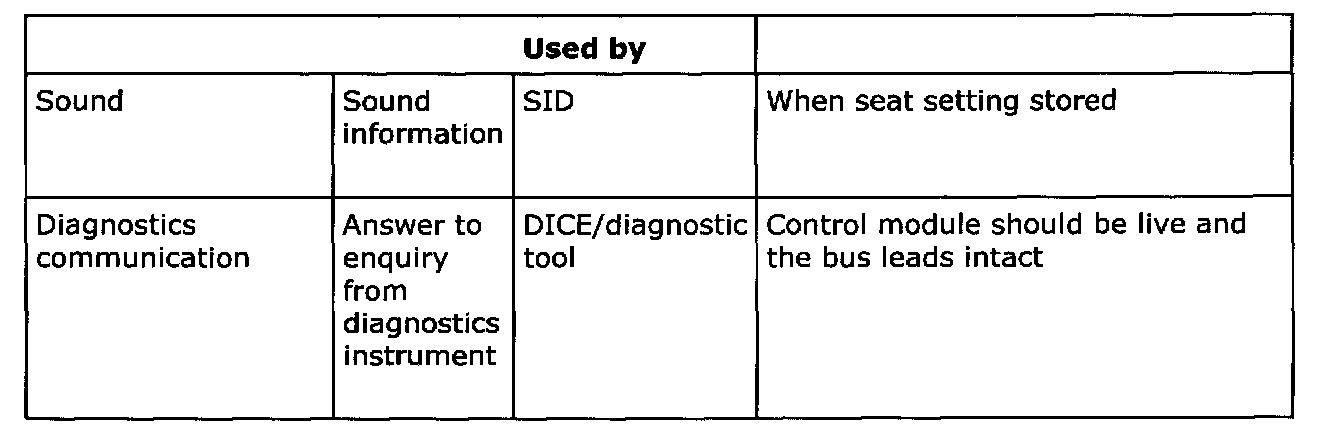 Below is a summary of the messages which are sent out by all the car's systems that are connected to a bus. It also shows which systems use the transmitted information. The purpose of the summary is to help you gain an understanding of the car's functional relationships, which is a fundamental prerequisite for rapid fault diagnosis.