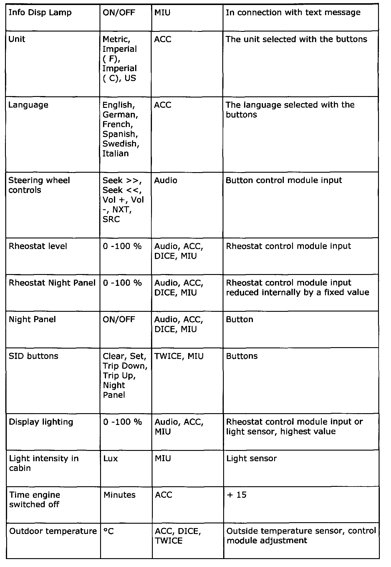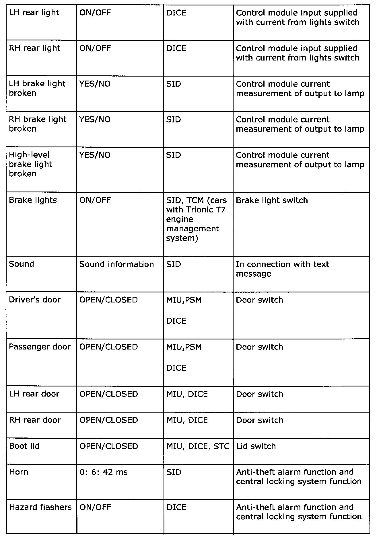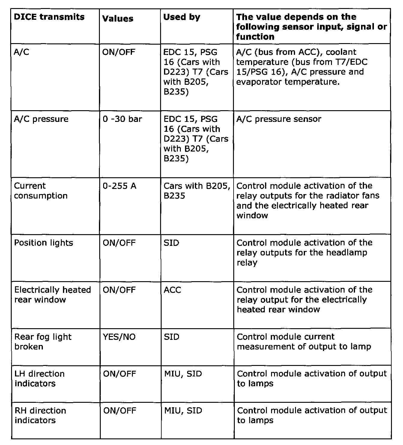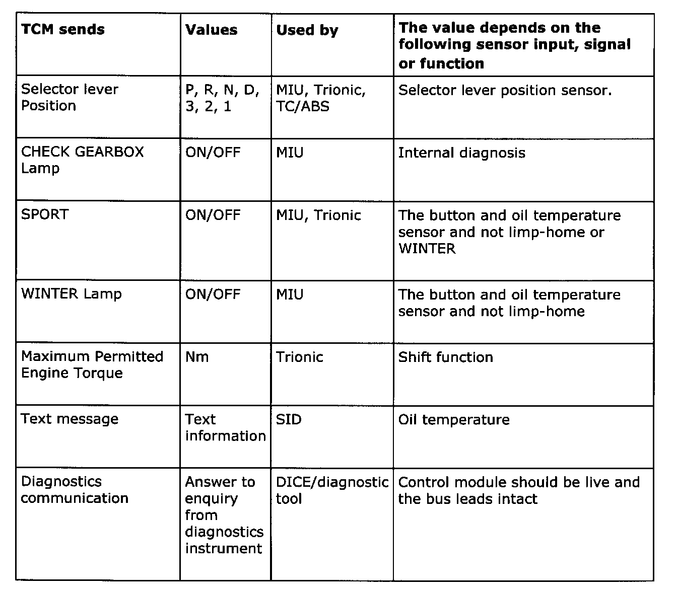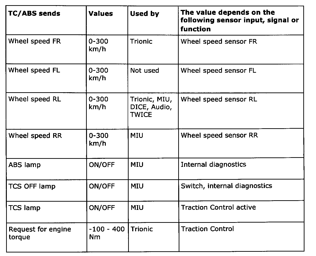 Below is a summary of the messages which are sent out by all the car's systems that are connected to a bus. It also shows which systems use the transmitted information. The purpose of the summary is to help you gain an understanding of the car's functional relationships, which is a fundamental prerequisite for rapid fault diagnosis.