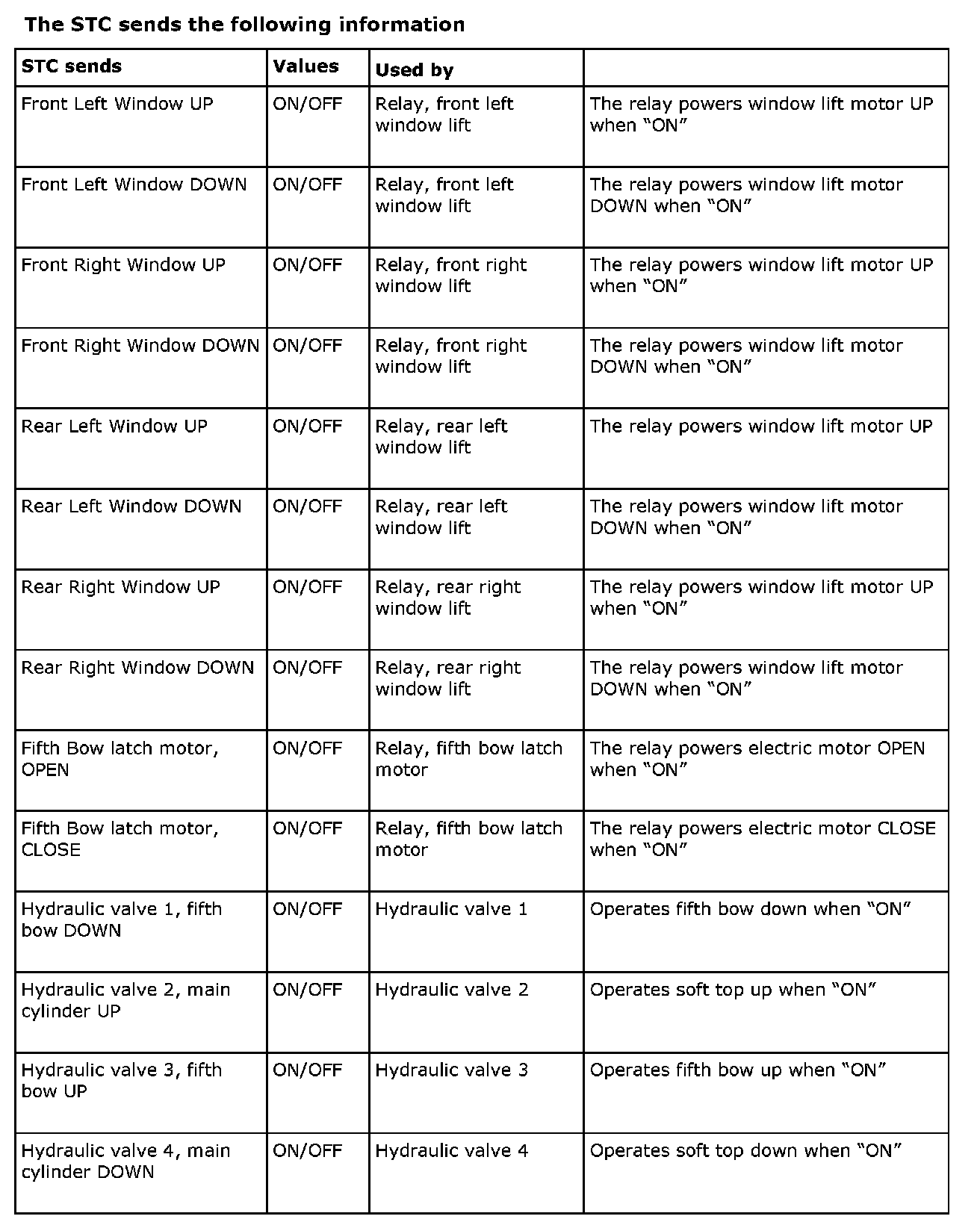 The VR-bus (Valve and Relay bus)is a single-lead bus communications link through which the STC control module controls one relay for each window lift, one relay for the fifth bow latch motor and the four electromagnetic hydraulic valves.