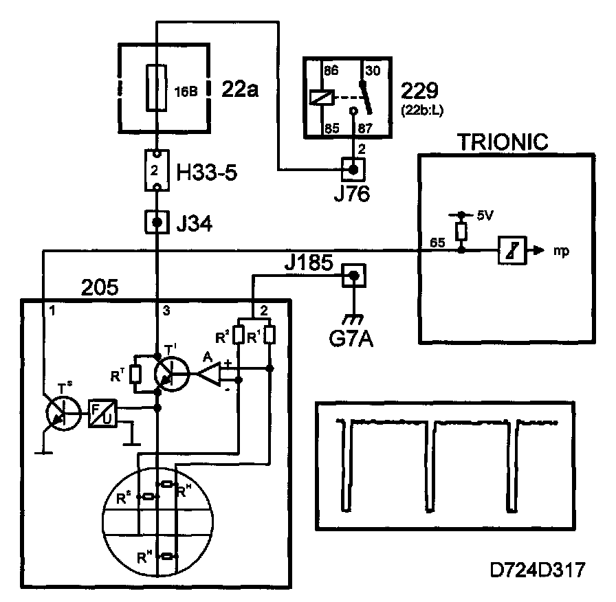 If RH is cooled by an airstream, its temperature will immediately be restored by increasing the current through transistor T1. The voltage required to maintain a constant resistance in RH is fed to a frequency converter, which in turn controls transistor T2. T2 grounds the control module input with a frequency corresponding with the air mass flow. The ground pulses have a duration of 40 ms.