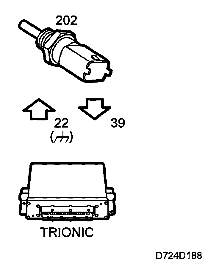 The control module measures the coolant temperature by supplying the sensor with 5 V from pin 39 via a 1.0 kOhm resistor integrated in the control module. The sensor is grounded via control module pin 22. The voltage across the resistor is proportional to the engine coolant temperature.