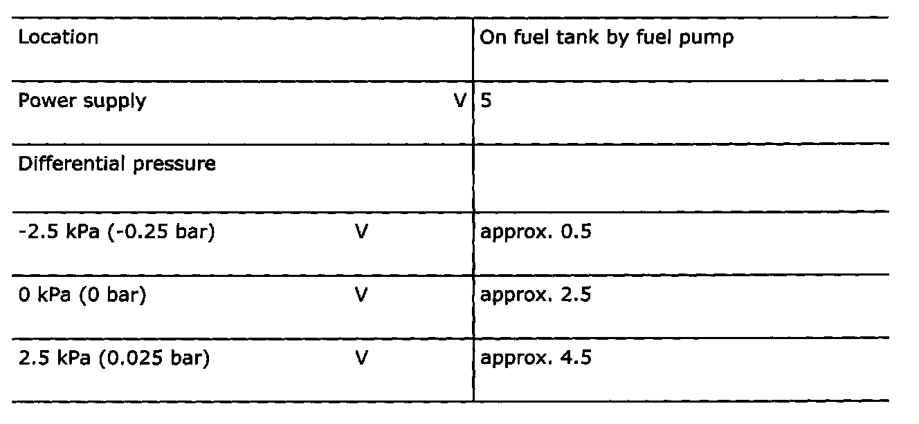 The pressure sensor determines the difference in pressure between the tank and the atmosphere, and supplies the control module with a proportional voltage.
