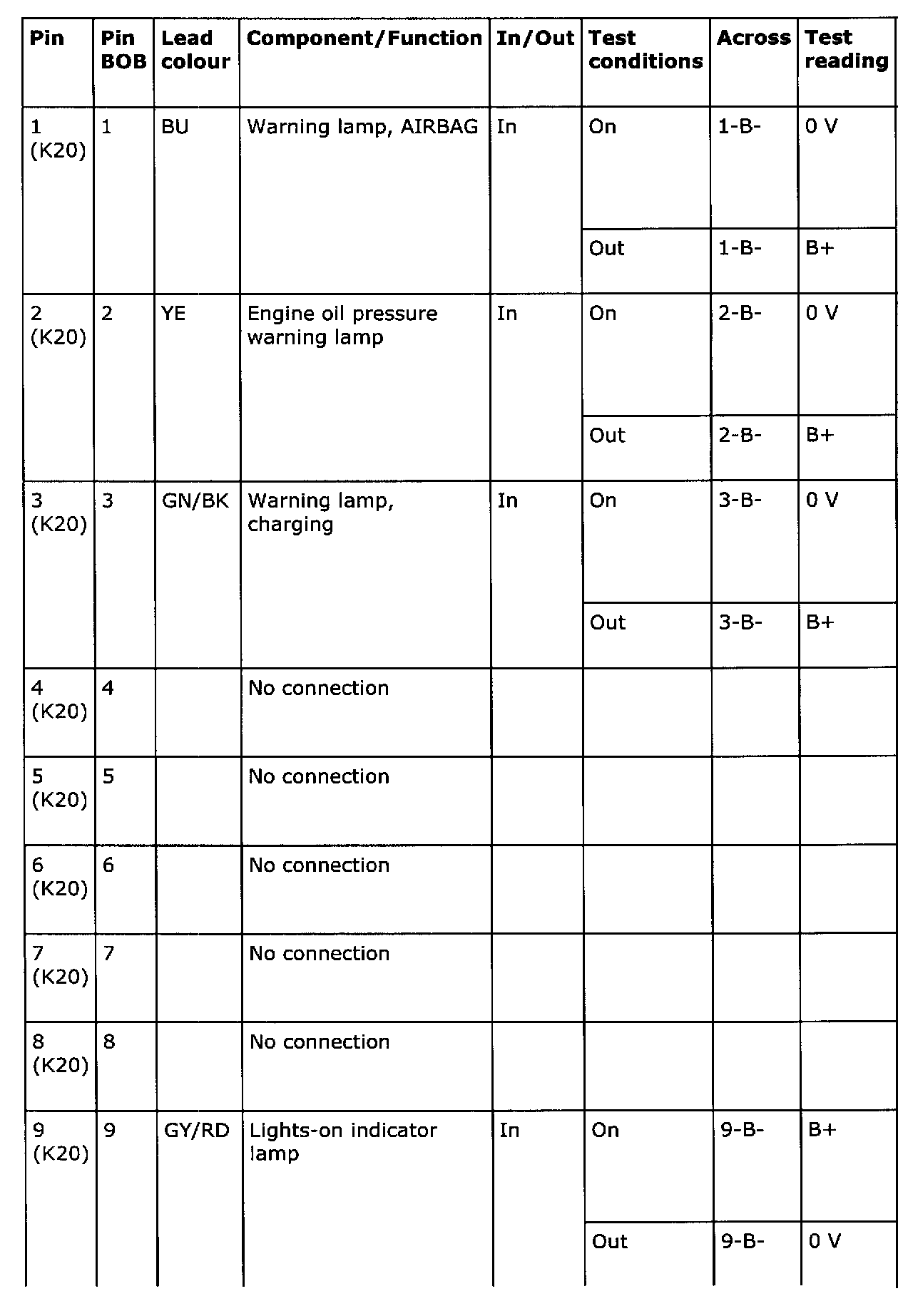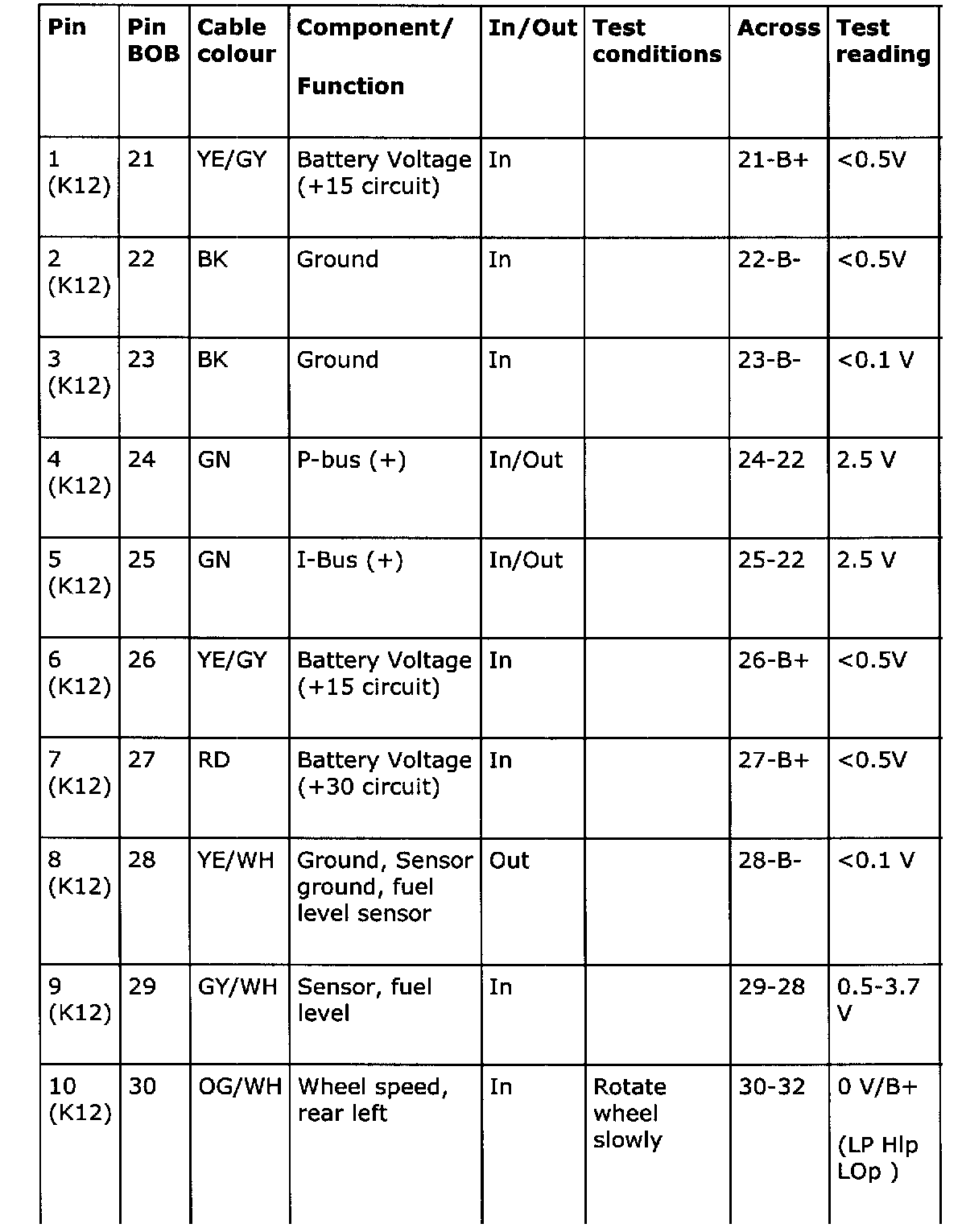 - The test readings presented are with the ignition ON unless otherwise stated.