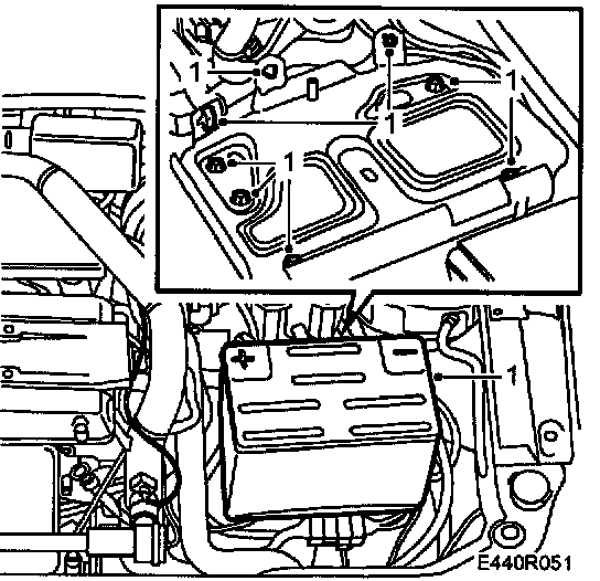 7. Fit the battery tray, the battery and the battery cover. Connect and secure the cables.
