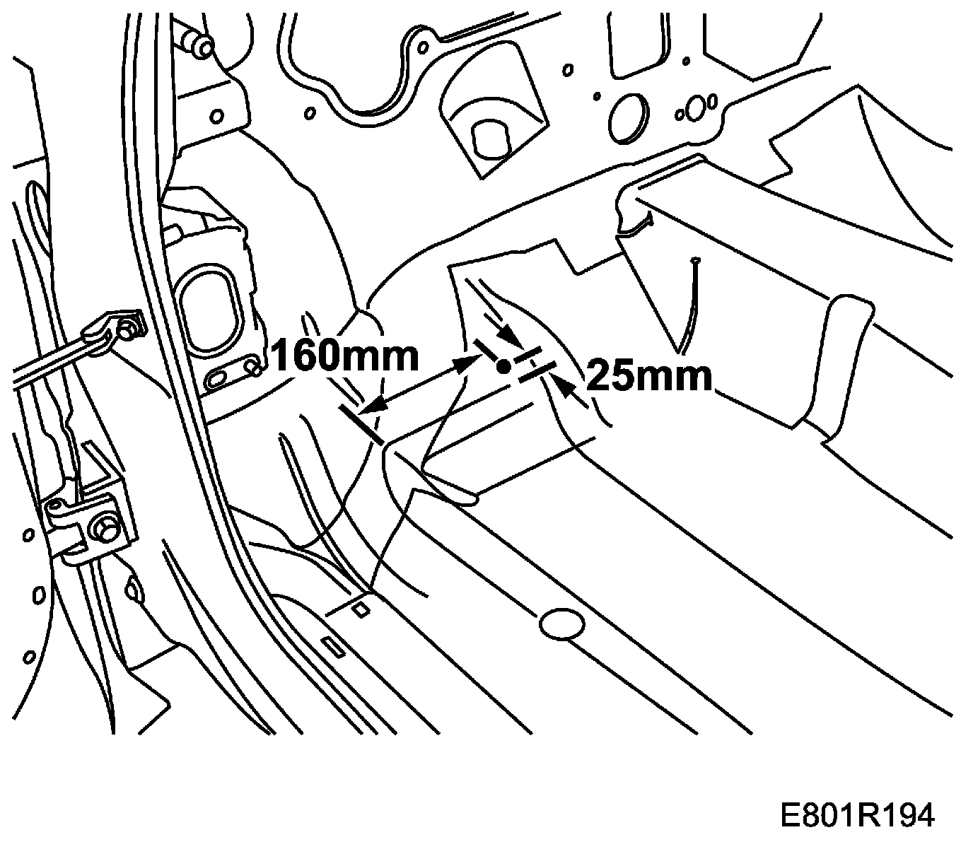 2. Measure 160 mm inwards from the corner of the pressing and 25 mm above it.