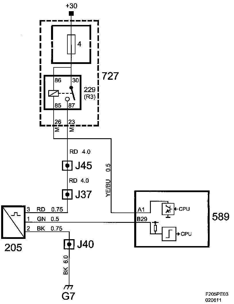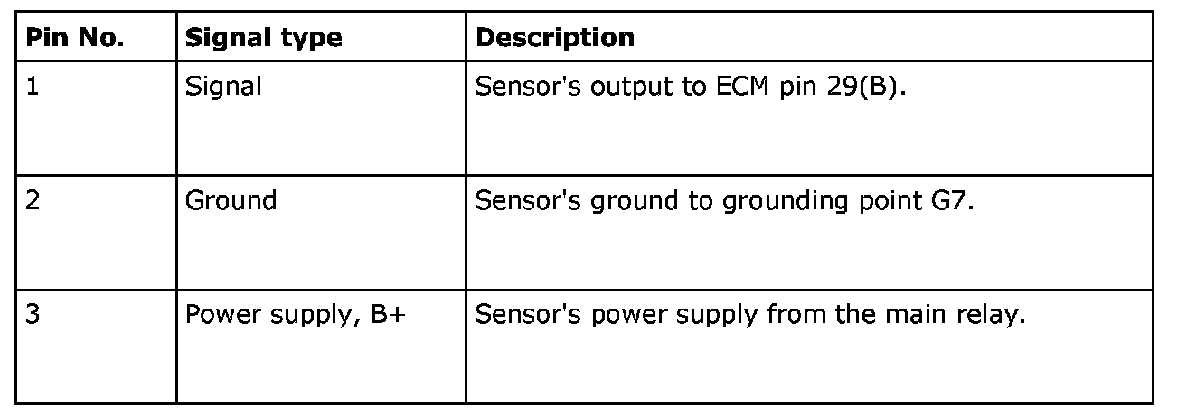 The mass air flow sensor is grounded in grounding point G7 and power is supplied from the main relay. Note that the control module has a pull-up to 5 V on control module input pin 29(B) and that the mass air flow sensor pulses to ground.