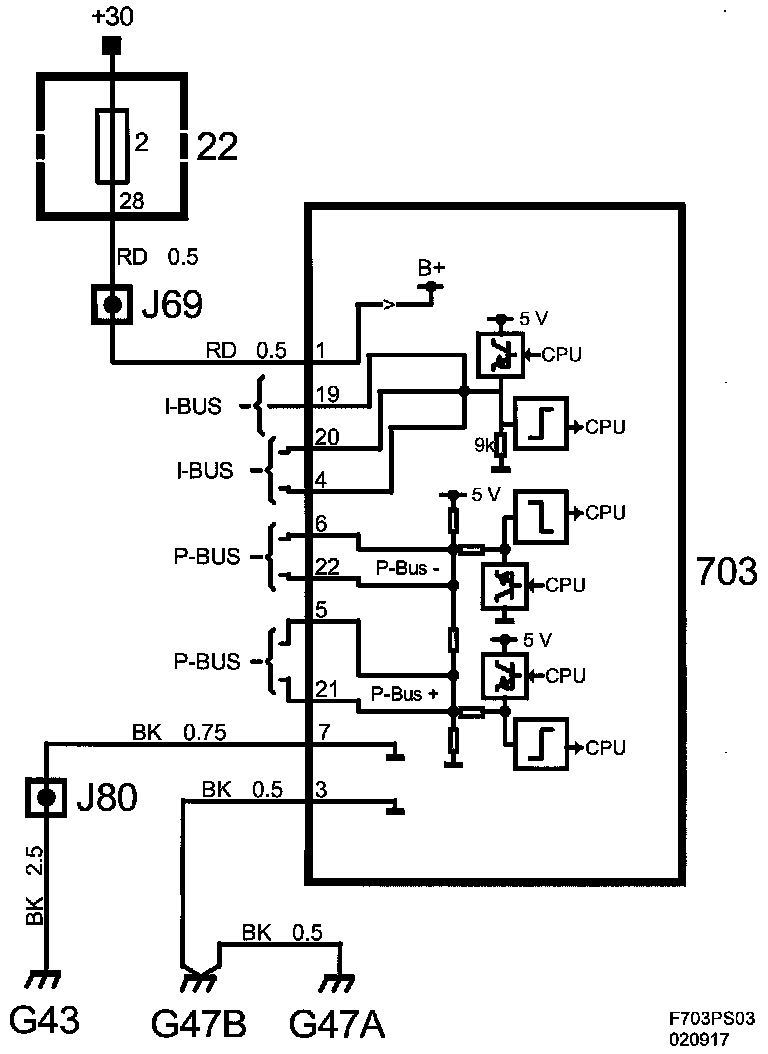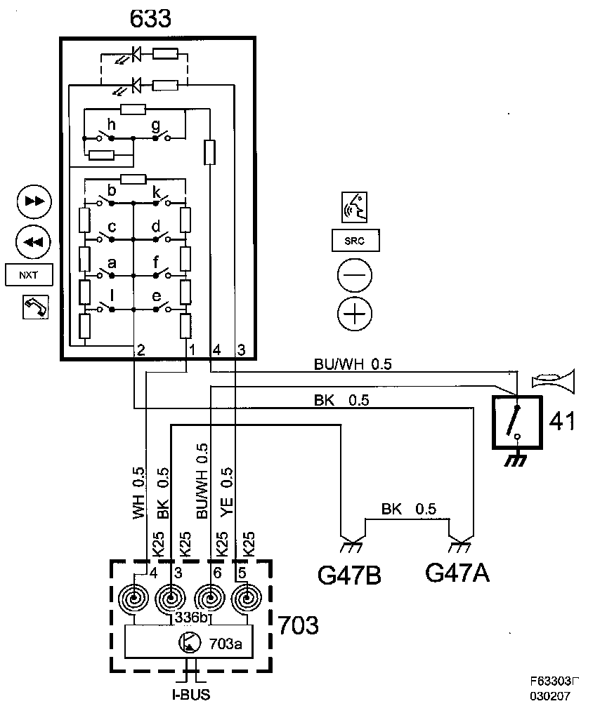 The sensor contains 4 Hall sensors and a microprocessor. The CIM continuously sends steering wheel angle information on the bus. 0 degree corresponds to a straight ahead position; a value which increases when the steering wheel is turned to the left. The sensor must be calibrated after changing the straight ahead position of the steering wheel or steering wheel replacement. Sensor fault requires CIM replacement.