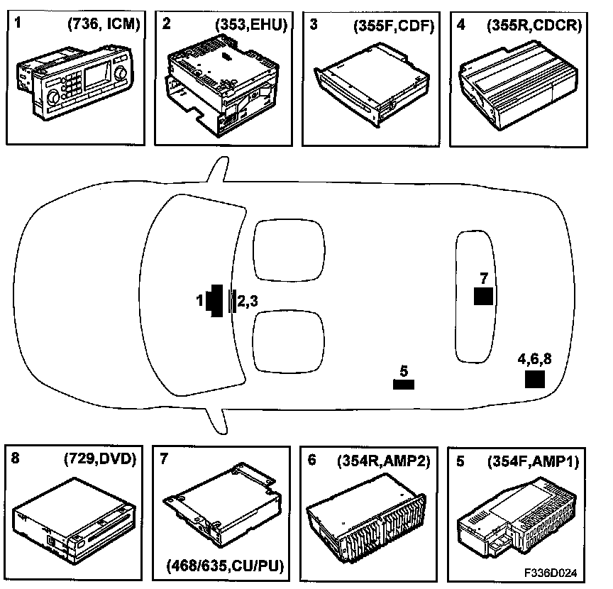 5. Audio System Amplifier, front speakers, AMP1 (354F)