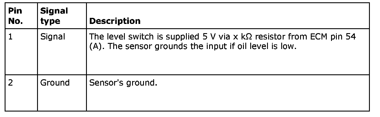 The engine control module then transmits the bus message "Oil level low", which is used by SID. The information from the oil level sensor is a filtered value as temperature, engine speed, acceleration, and speed are used to calculate the average oil level.